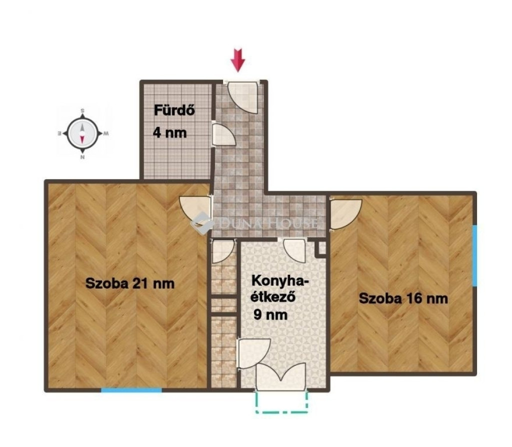 Helyiséget: 2 db szoba (21 nm és 17 nm), tágas konyha-étkező (9,2 nm) kamrával, fürdőszoba (4 nm), valamint különálló mellékhelyiség. A konyhából 2 m2 erkély nyílik.