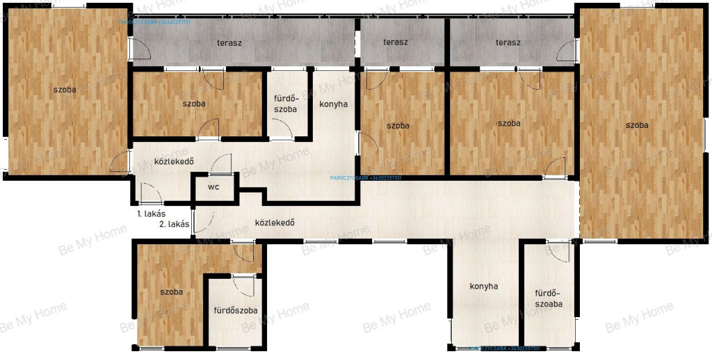 A lakás részei: hatalmas nappali, 5 szoba, gépesített konyha étkezővel,