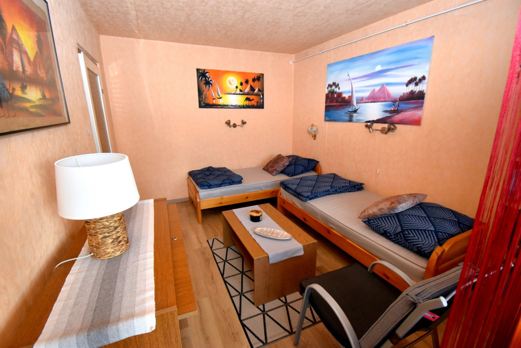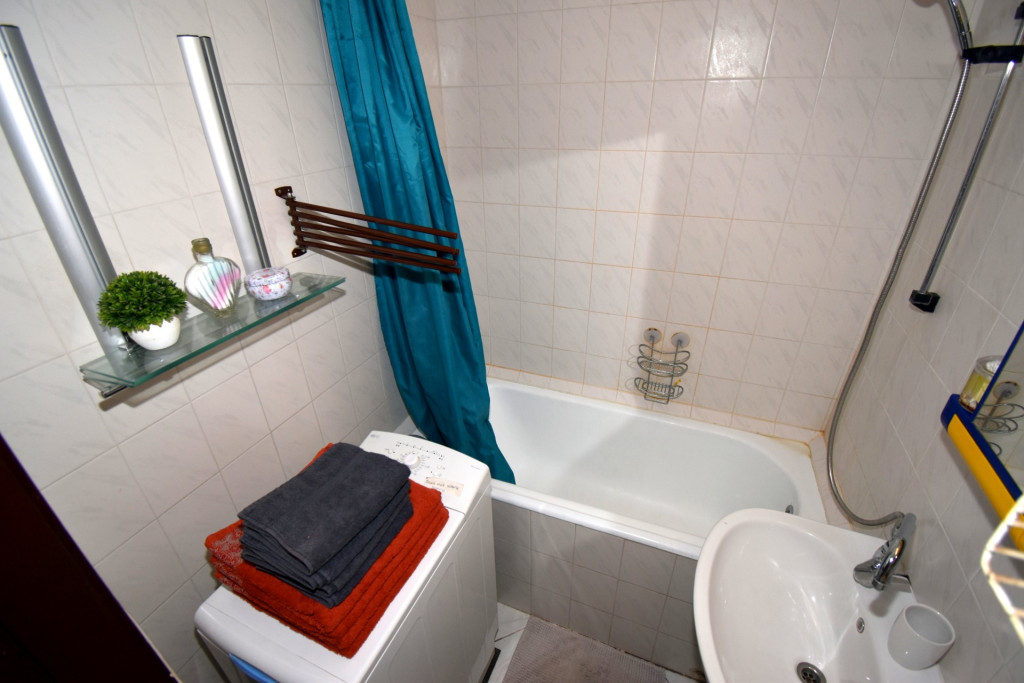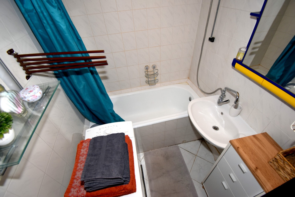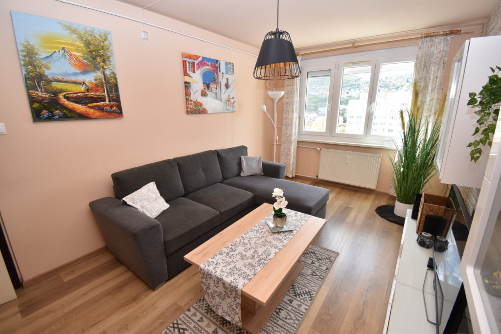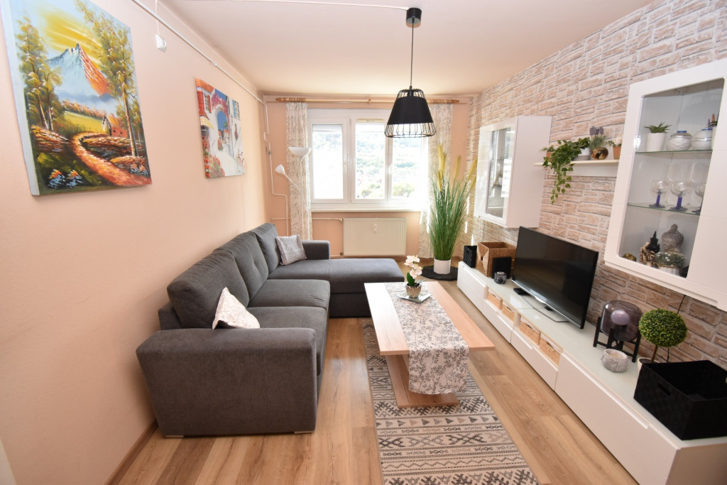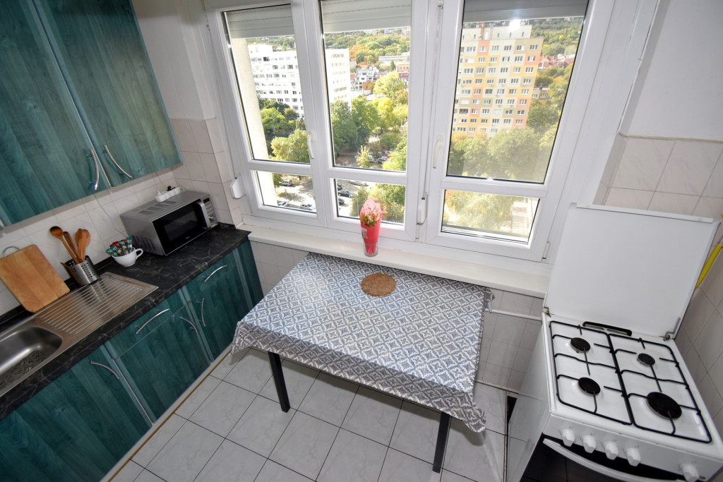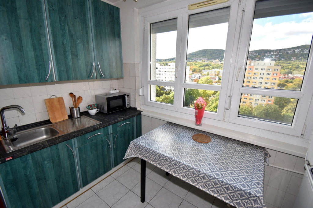 A két különnyíló szoba (12 és 17 m²) laminált parkettával burkolt, a többi helyiség járólapos. A fürdőszoba kádas, a WC külön helyiségben kapott helyet. A világos, nagy ablakos konyhából és az étkezőasztaltól is csodás kilátás nyílik a hegyekre.