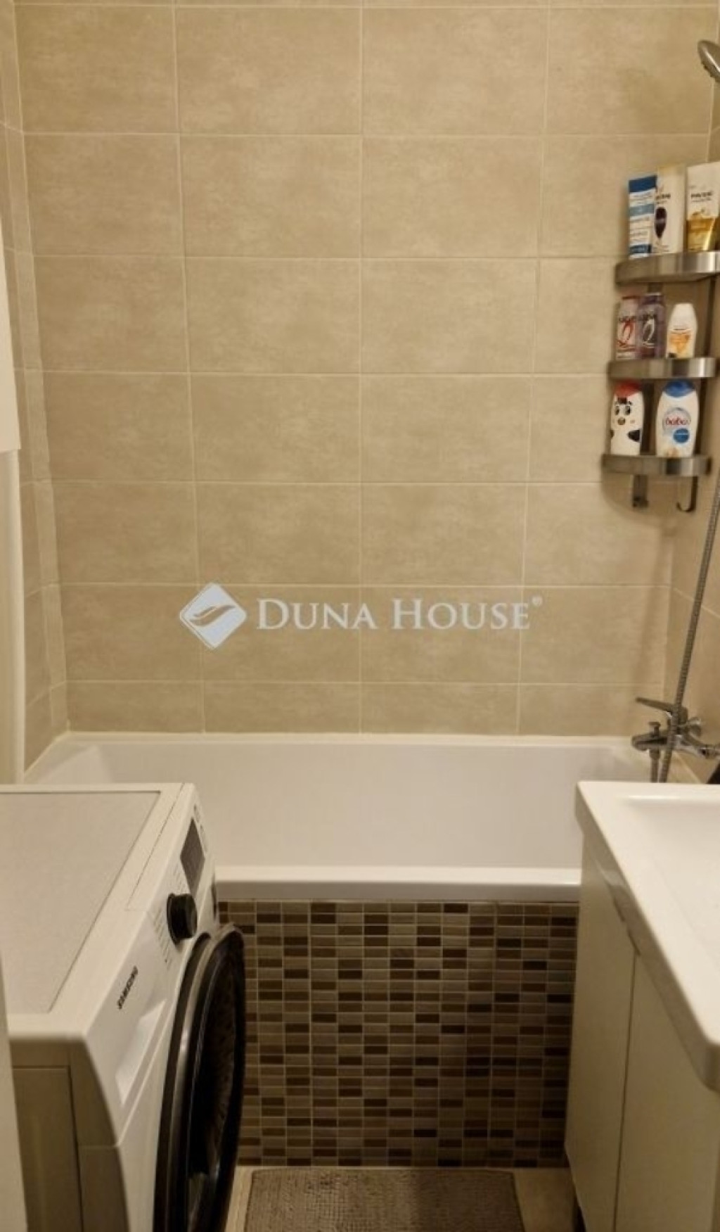 A fürdőszoba és a WC mennyezetig csempézett, a szaniterek minőségi anyagokból (Ravak, Mofém, Geberit, Alföldi) állnak.