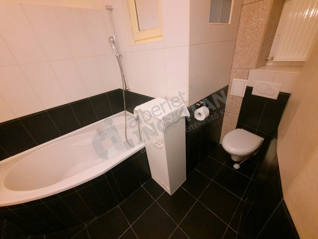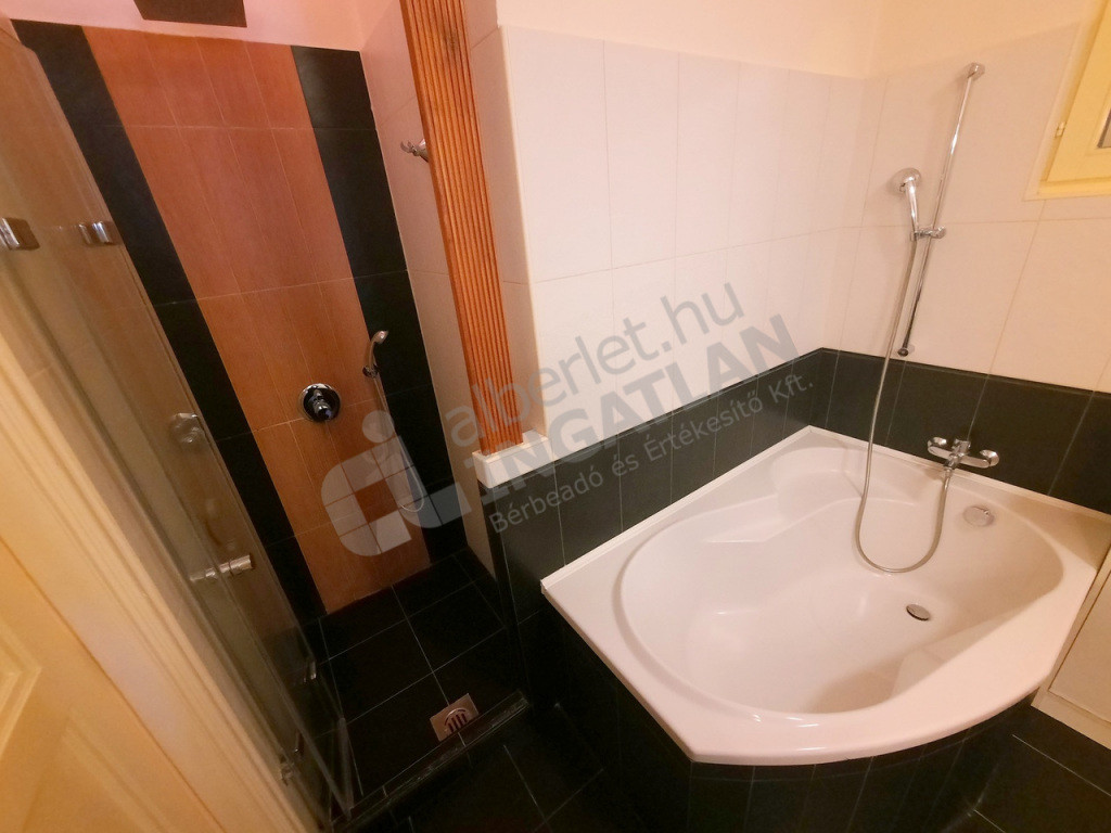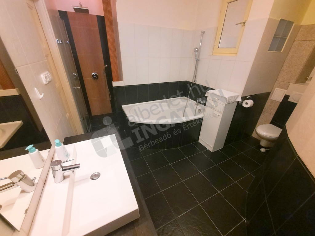 Tágas fürdőszoba, melyben WC, fürdőkád és zuhanyzó is van, plusz külön WC kézmosóval.