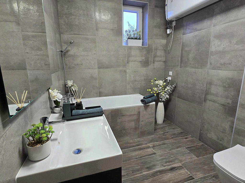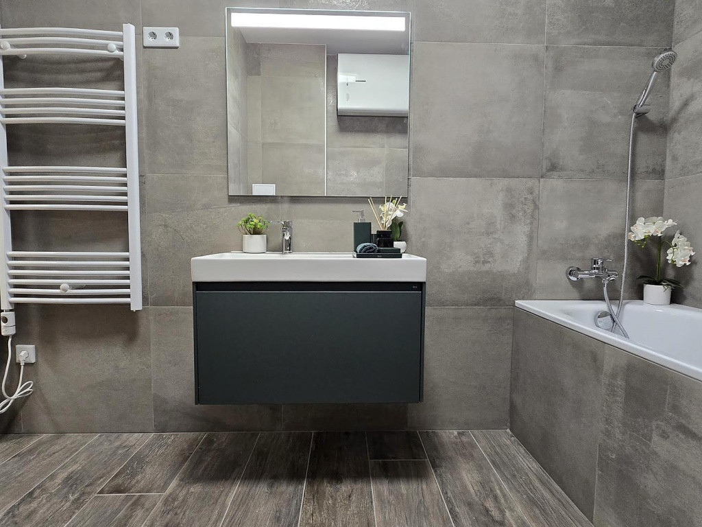 A fürdőszoba és a különálló WC letisztult, minőségi anyagokkal készült. ROCA és LAUFEN szaniterek, GROHE csaptelepek, ROCA LED világításos tükör és új Ariston villanybojler került beépítésre – minden új, minden egységes.
