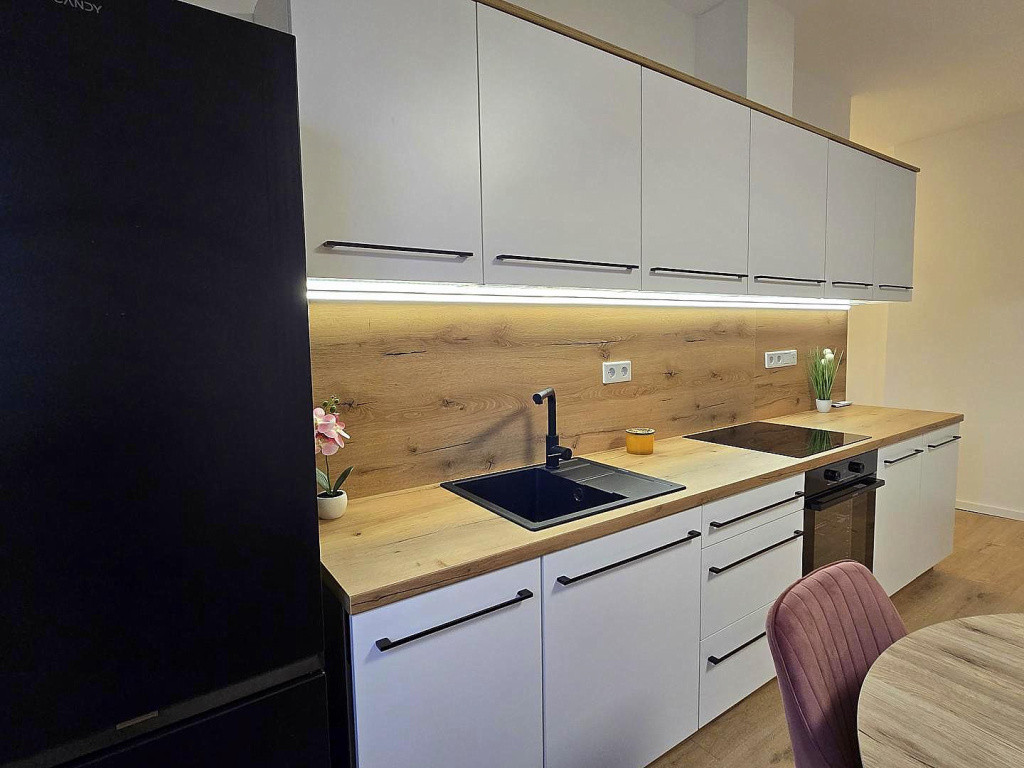 A konyha egyedileg gyártott, 390 cm hosszú, matt fehér–tölgy kivitelben készült, teljesen új, használatlan állapotban. A beépített gépek garanciálisak, a fekete gránit mosogató és csaptelep pedig időtálló, elegáns megjelenést ad a térnek.