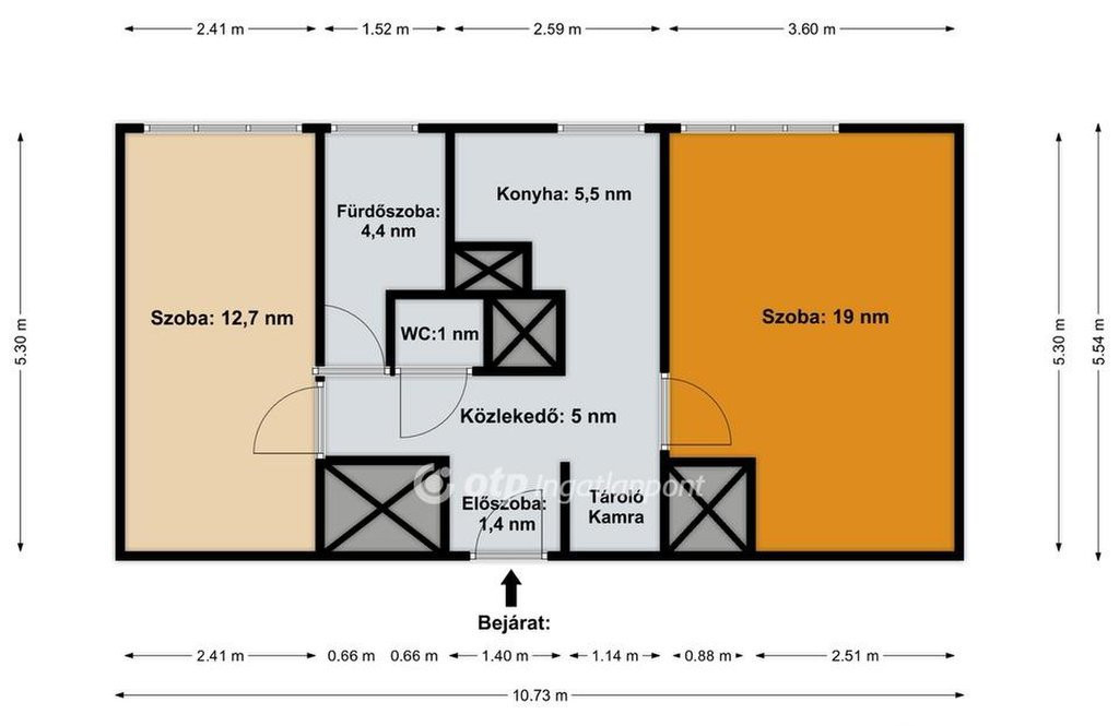 Az ingatlan világos, DK tájolású, praktikus elrendezésű, külön nyíló szobákkal. A fürdőszoba és a WC külön helyiségben található, ami kényelmes megoldás a mindennapokban.