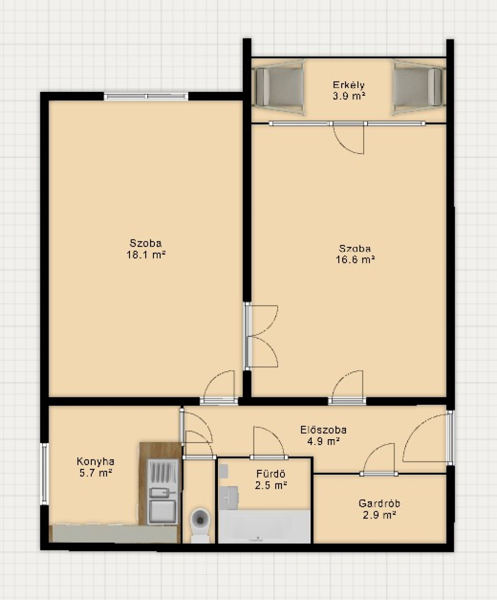 - 2 szoba, előszoba, külön WC és fürdő, gardrób, terasz
