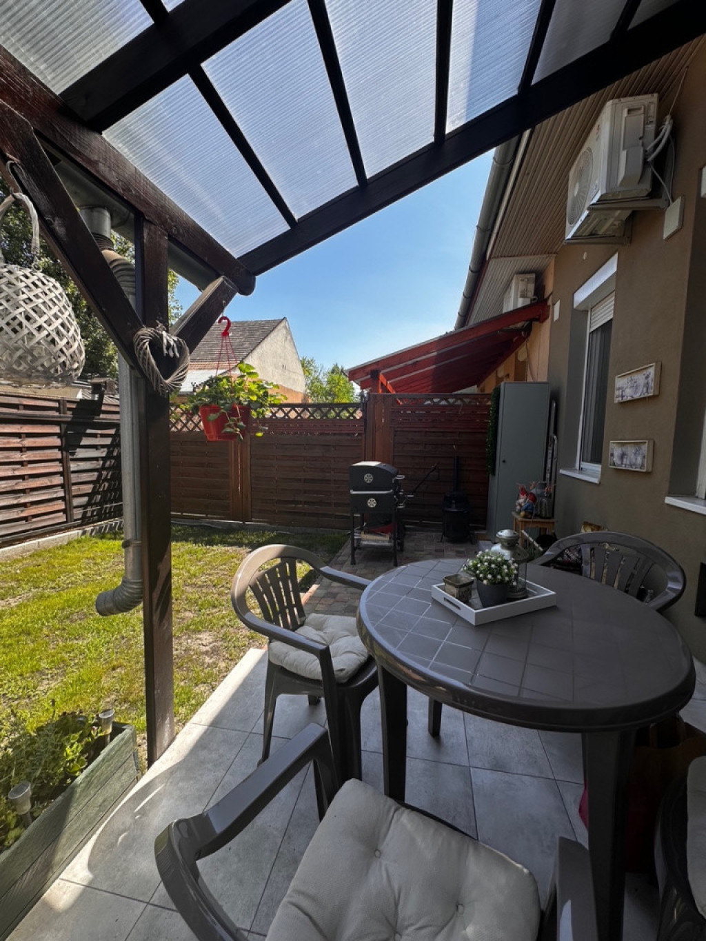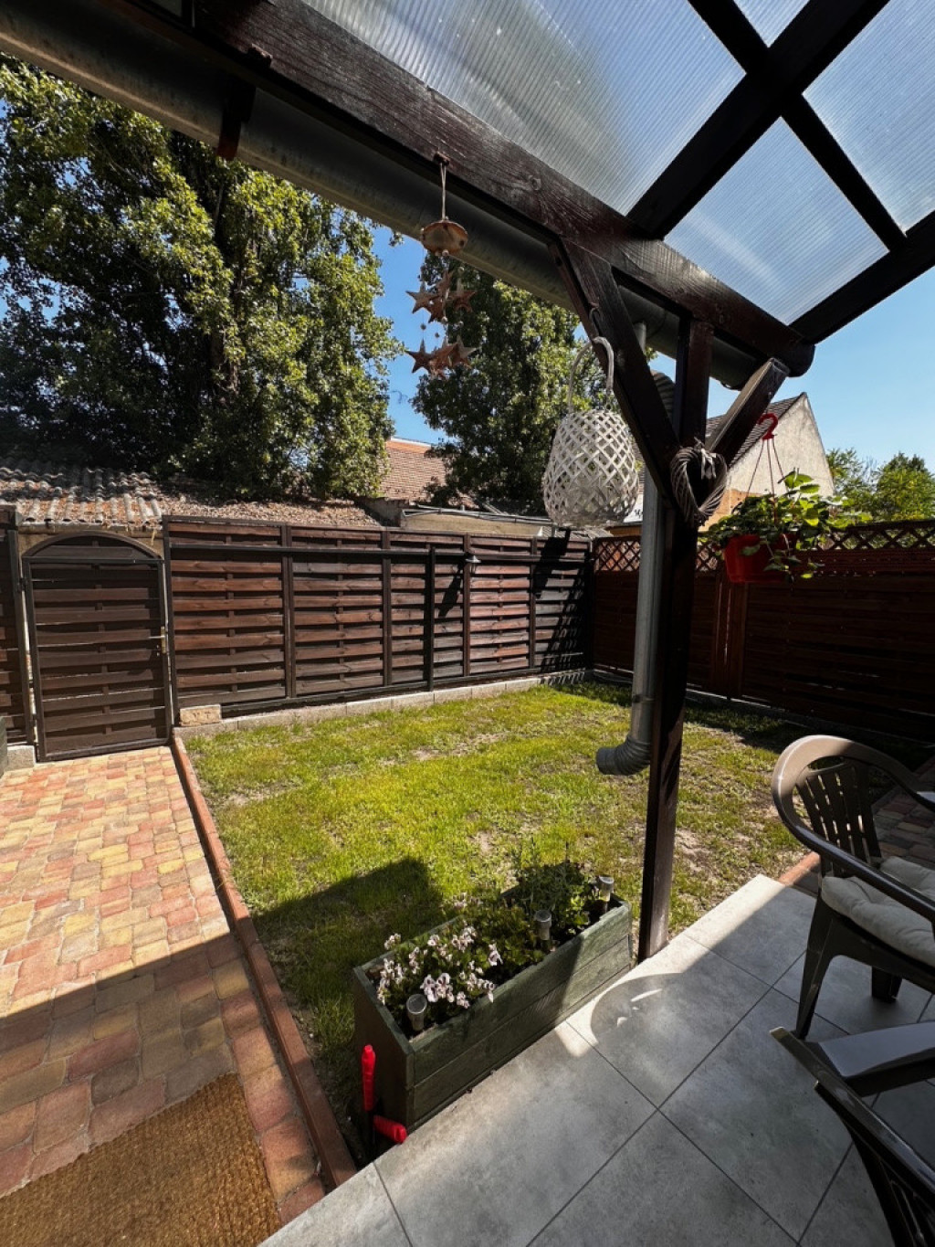 Saját lekerített kert (kb 50 m2), melynek része a 14 m2-es fedett terasz. A lakáshoz tartozik még egy 8 m2-es tároló.