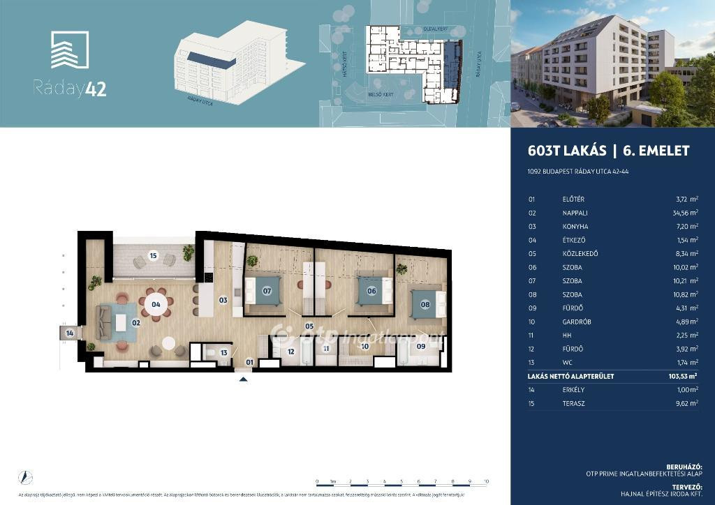 Budapest IX. kerületében, a Ráday utca 42. szám alatt kínálunk eladásra egy nappali + 3 szobás, 103,54 nm-es, 10,62 nm terasszal rendelkező lakást, amely egy különleges fejlesztés része. Az épület egy meglévő struktúra újragondolásával, magas műszaki tartalommal és környezettudatos megoldásokkal születik újjá.