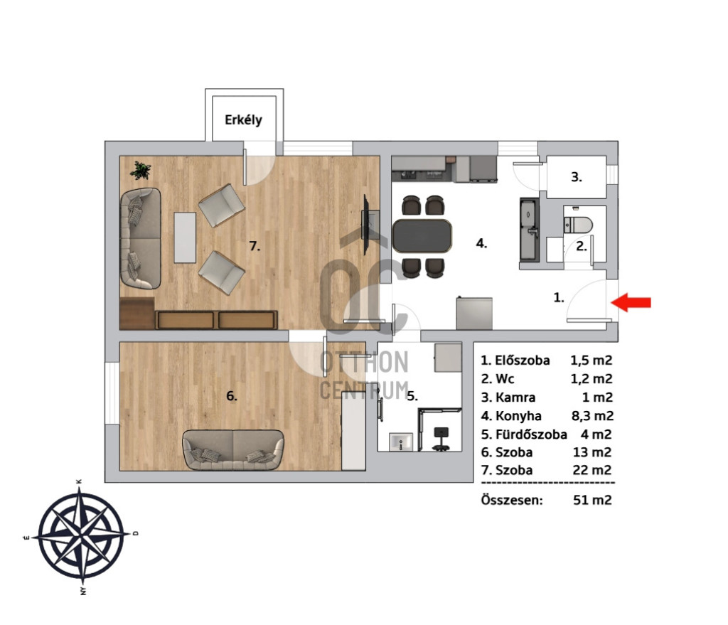 - Felosztása: előszoba, erkélyes nappali, hálószoba, konyha, kamra, konyha, közlekedő, fürdőszoba - wc.
