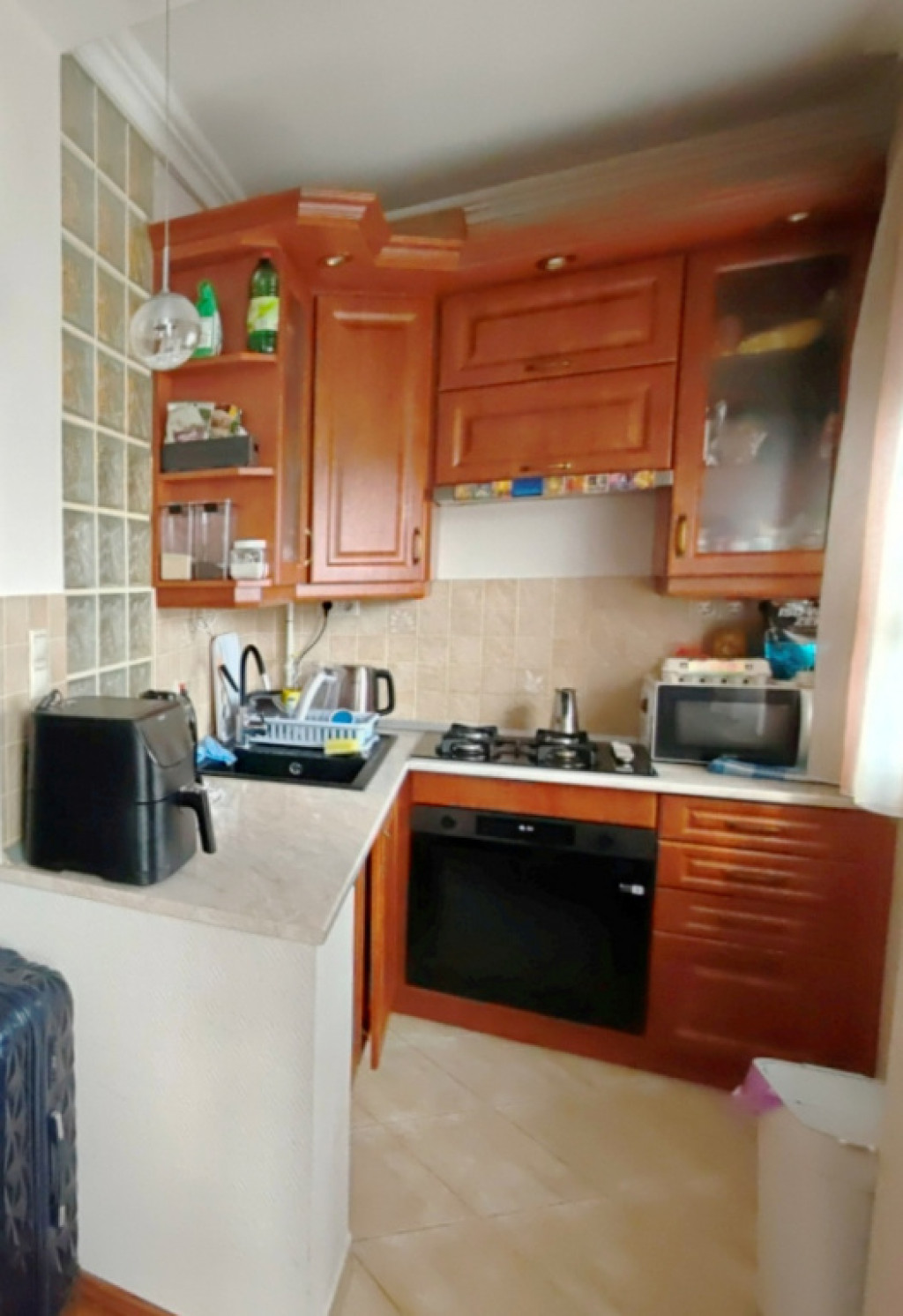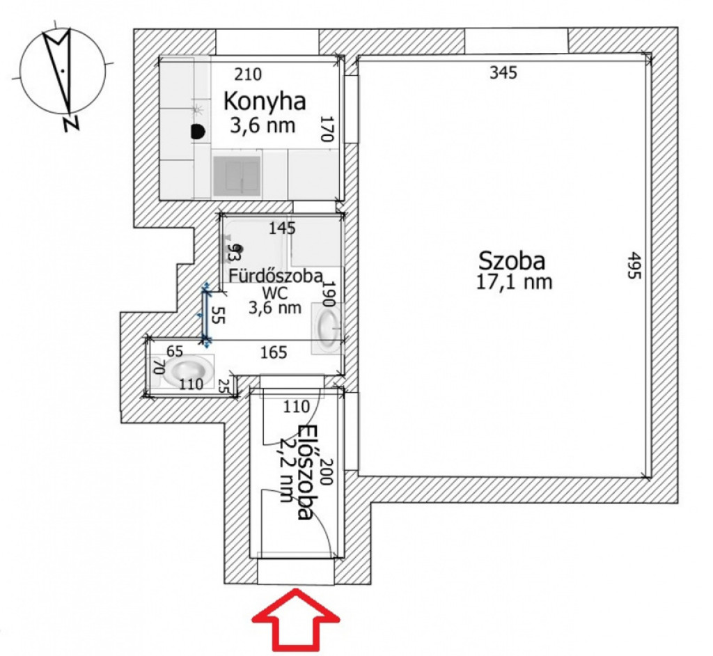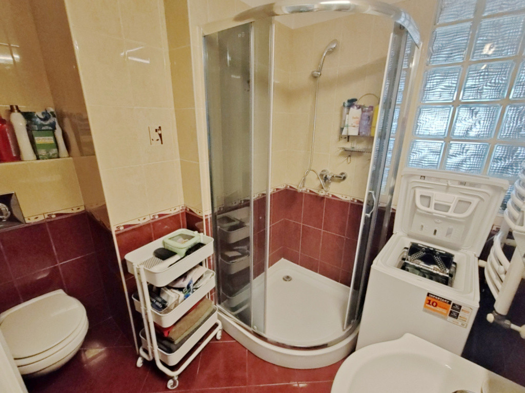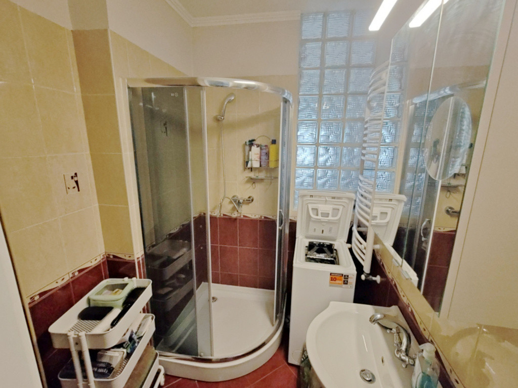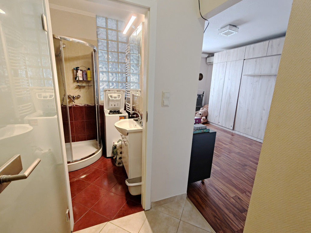 • Fürdő: Praktikus zuhanyzós fürdőszoba toalettel. Az üvegtégla falmegoldásnak köszönhetően a konyha felől természetes fény is érkezik a helyiségbe.