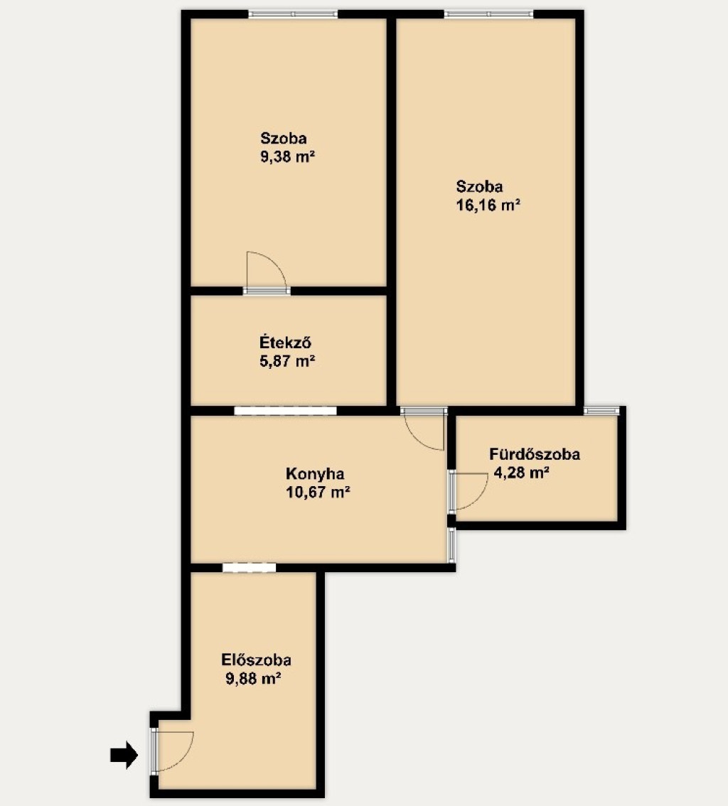 A lakás praktikus elosztású, a szobák külön nyílnak. Helyiségei: nappali, hálószoba, külön étkező, ablakos konyha, valamint ablakos, sarokkádas fürdőszoba. Az ingatlan része egy közel 10 m²-es, tágas előszoba, ahol jelenleg egy nagy gardróbszekrény kapott helyet, de akár a konyhával egybenyitható.