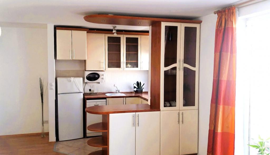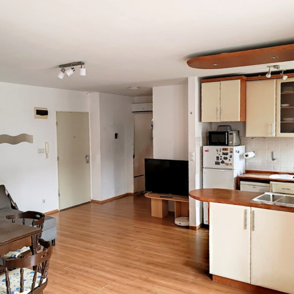 A lakás elrendezése élhető és praktikus: kis előtérből érkezünk a világos, amerikai konyhás nappaliba, amelyhez egy leválasztható dolgozórész is kapcsolódik – ideális megoldás otthoni munkavégzéshez vagy vendégrész kialakításához. A hálószoba tágas, napfényes, nyugodt pihenést biztosít. A fürdőszoba és a WC külön helyiségben található, a fürdőben mosógép is helyet kapott.