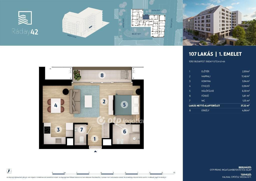 Budapest IX. kerületében, a Ráday utca 42. szám alatt kínálunk eladásra egy 1 szobás, 37,32 nm-es, 4,86 nm terasszal rendelkező lakást, amely egy különleges fejlesztés része. Az épület egy meglévő struktúra újragondolásával, magas műszaki tartalommal és környezettudatos megoldásokkal születik újjá.