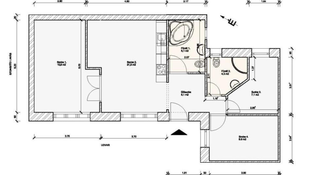 A lakás három hálószobás, két fürdőszobával, amerikai konyhás nappalival és tágas előszobával rendelkezik.