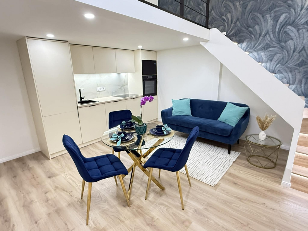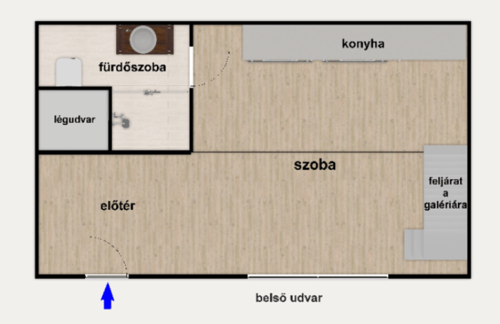 Az ingatlan bruttó 40 nm, 27 nm-es alapterületét a több, mint 4 méteres belmagasságot kihasználva egy 13 nm-es, teljes értékű, 183 cm belmagasságú galériaszint egészíti ki. Jól megtervezett belső kialakításának köszönhetően kis mérete ellenére a lakás a tágasság érzetét kelti.