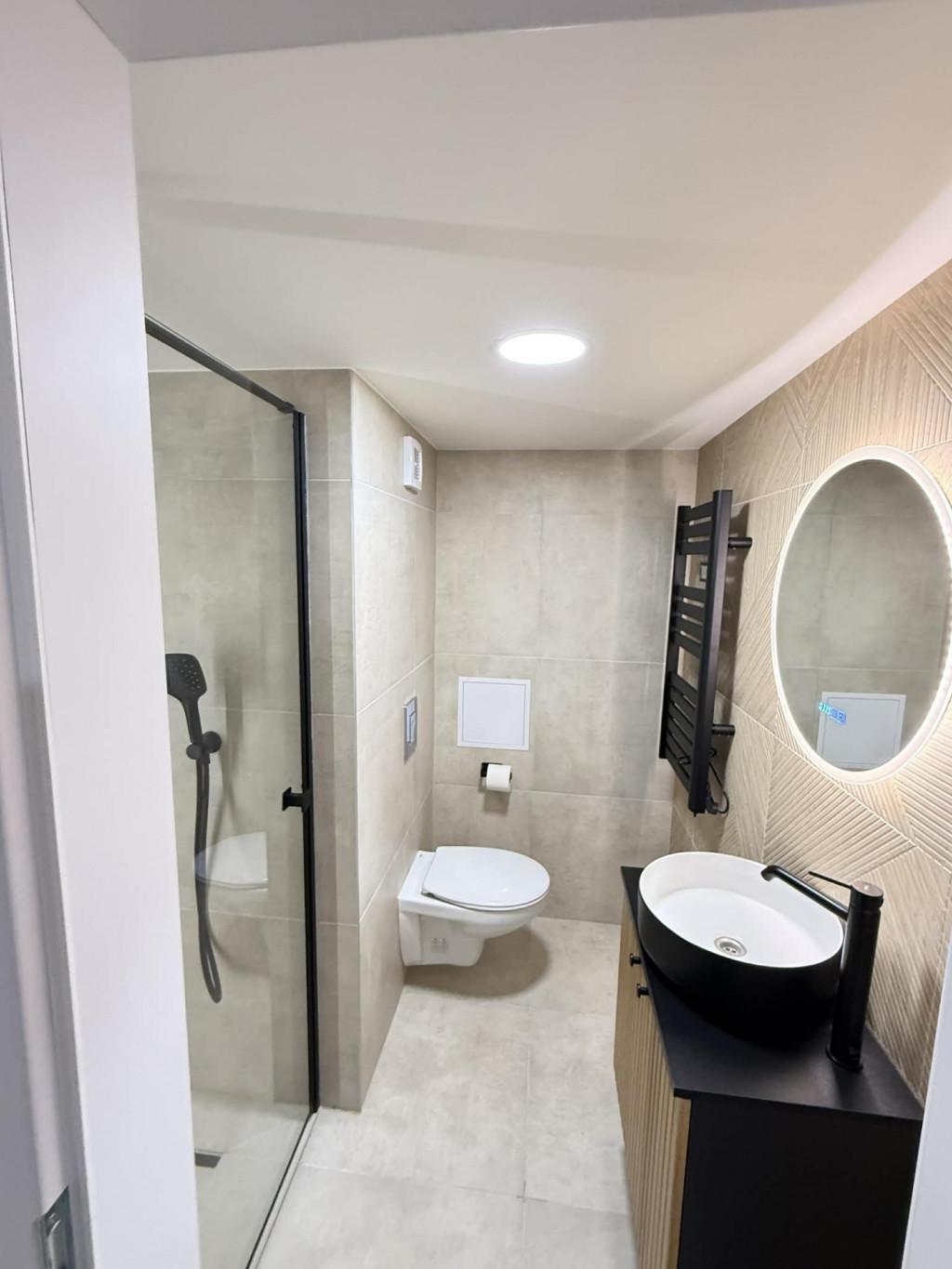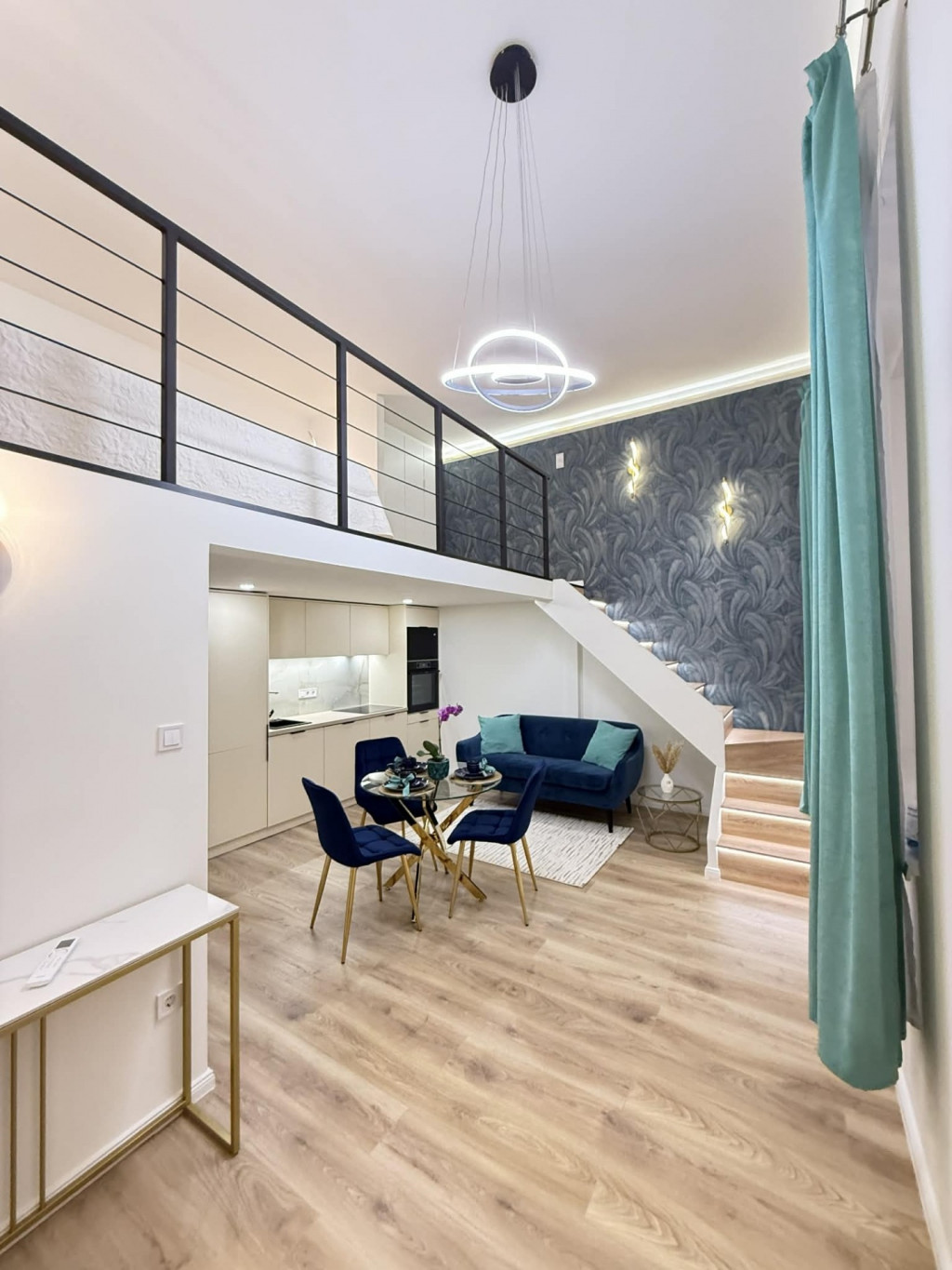 A galéria alatt, a 207 cm belmagasságú térben került elhelyezésre a méretre készült, gépesített konyha elektromos főzőlappal, sütővel, mikróval, kéménybe kötött páraelszívóval, mosogatógéppel, mosógéppel, beépített hűtővel felszerelve. Szintén innen nyílik a jó méretű, épített zuhannyal ellátott, dekoratív fürdőszoba.