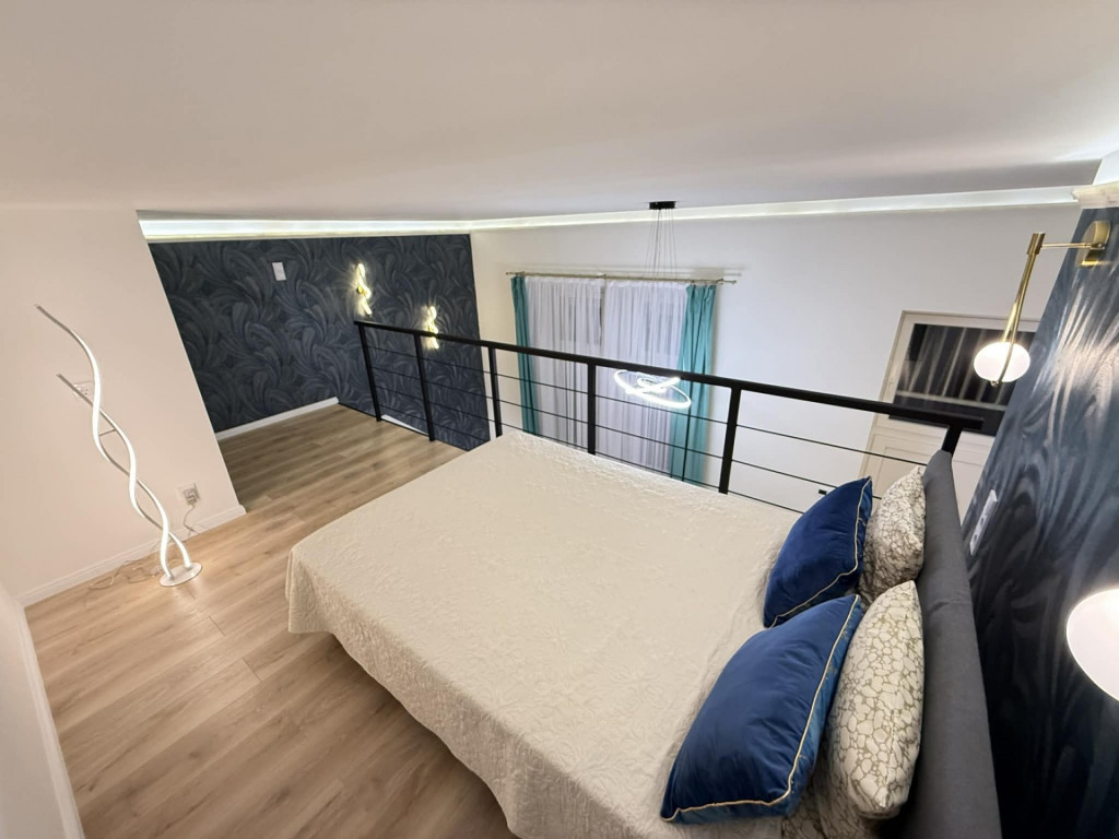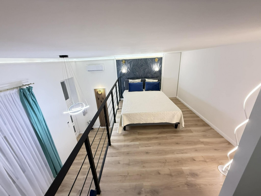 A szoba végéből kényelmes lépcső vezet fel a légies megjelenésű galéria szintre, ahol a franciaágyon kívül méretes gardróbszekrény is helyet kapott.