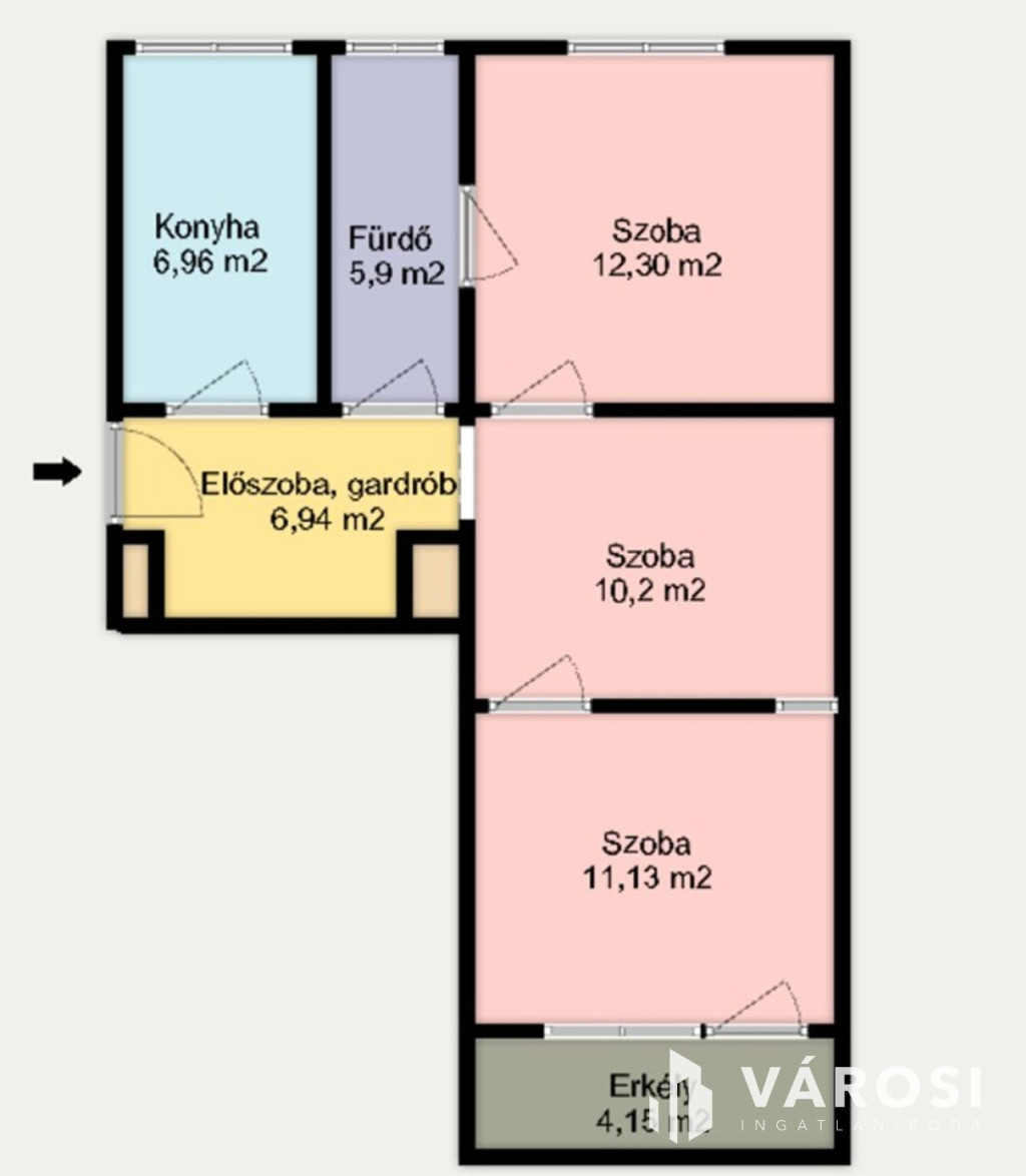Az ingatlan a tulajdoni lap szerint kétszobás, de három szobássá lett alakítva, amely elrendezést a csatolt alaprajzon megtekinthet.