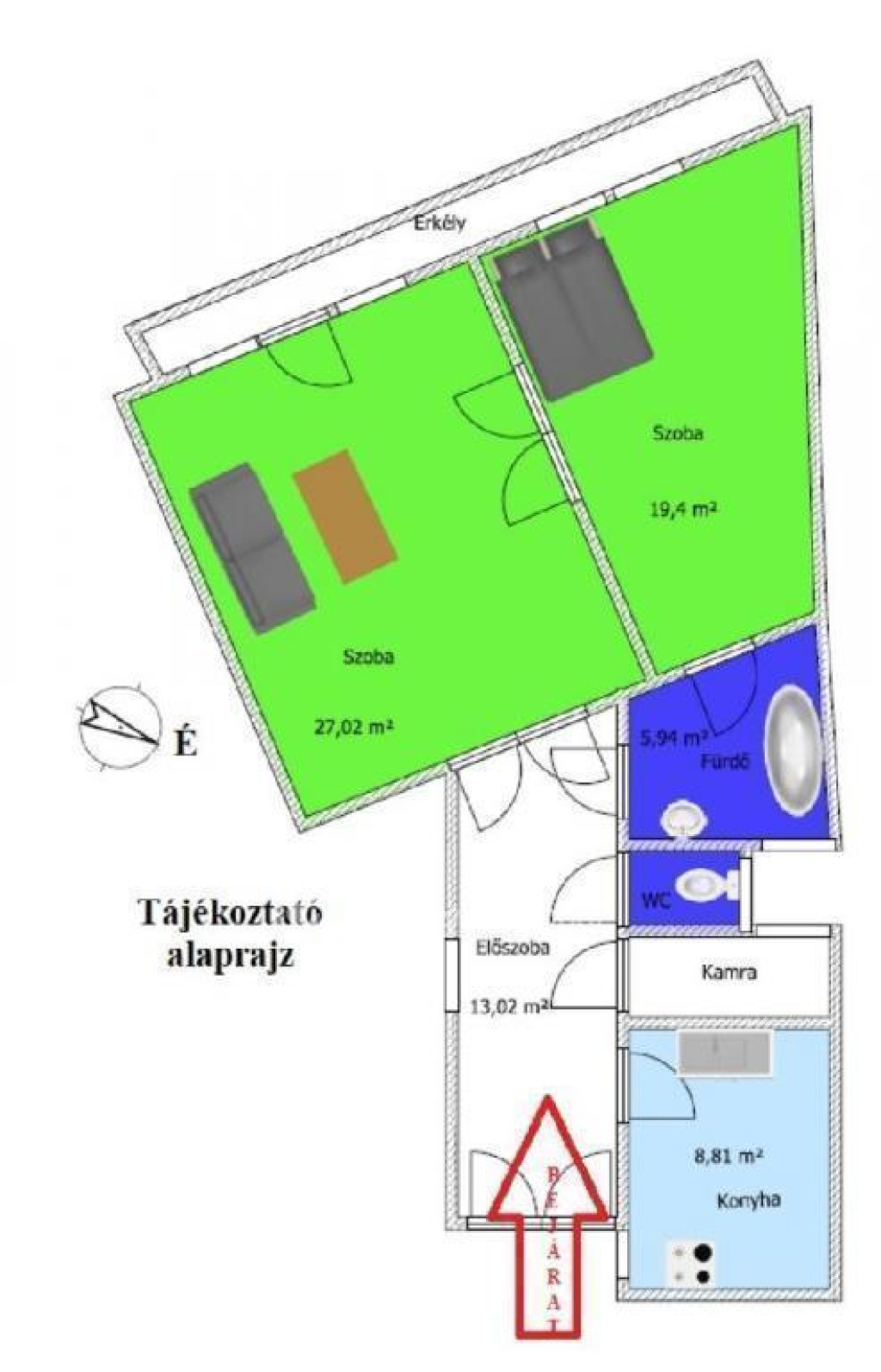 Helyiségei: Előszoba, konyha, kamra, wc, fürdő és 2 tágas szoba, melyből az egyik erkély kapcsolattal, a másik közvetlen fürdőszobai kapcsolattal rendelkezik.