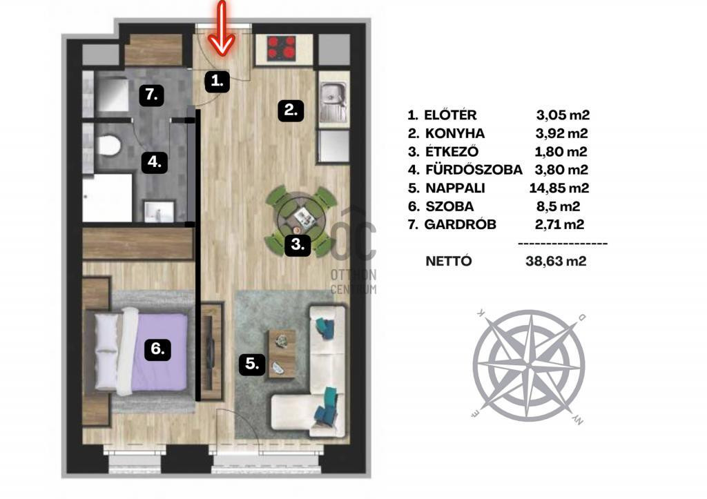 - Felosztása: előtér, Nappali konyha-étkező, félszoba, fürdőszoba, gardrób.