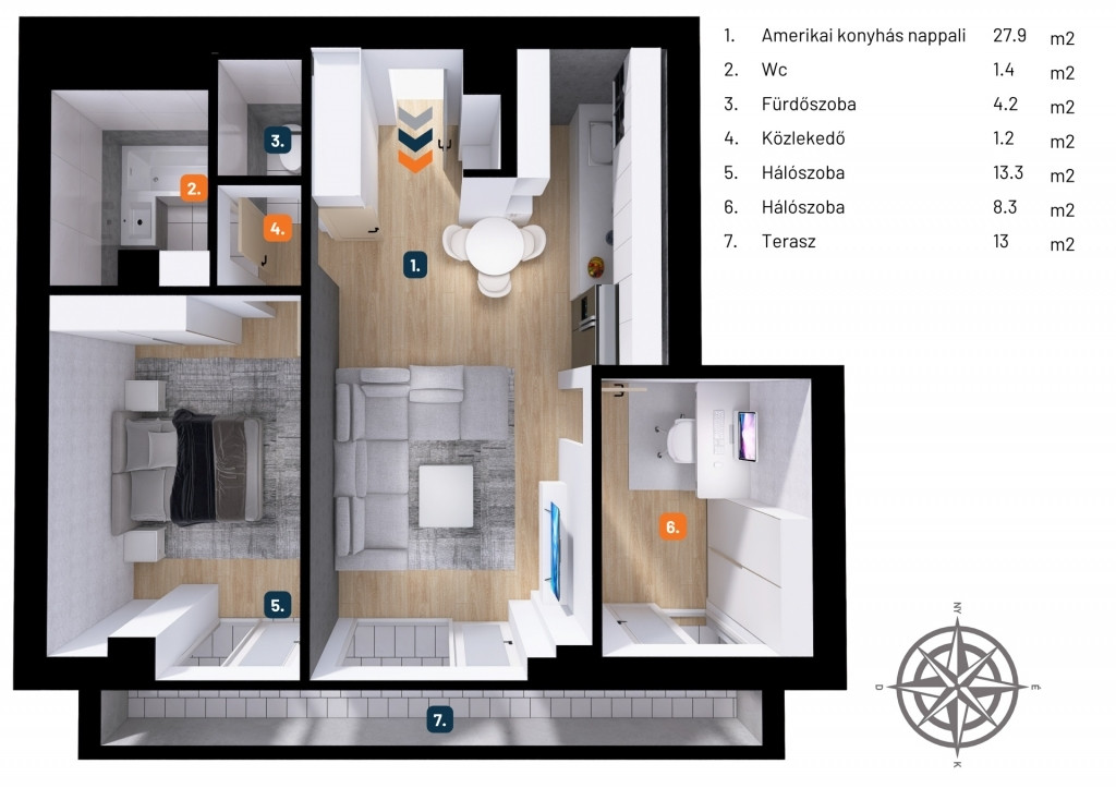 2. emeleti, 58 m²-es, 3 szobás, 13 m2-es erkéllyel rendelkező modern ingatlan.