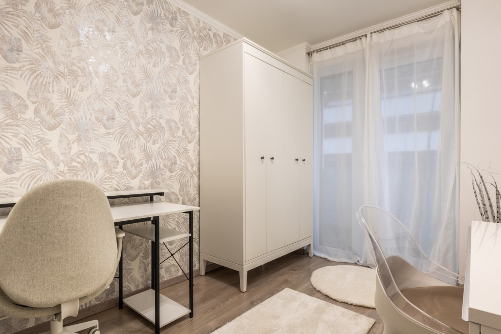 Kialakítása és színvilága modern, elosztása logikus, a lakás keleti tájolású, világos és csendes.