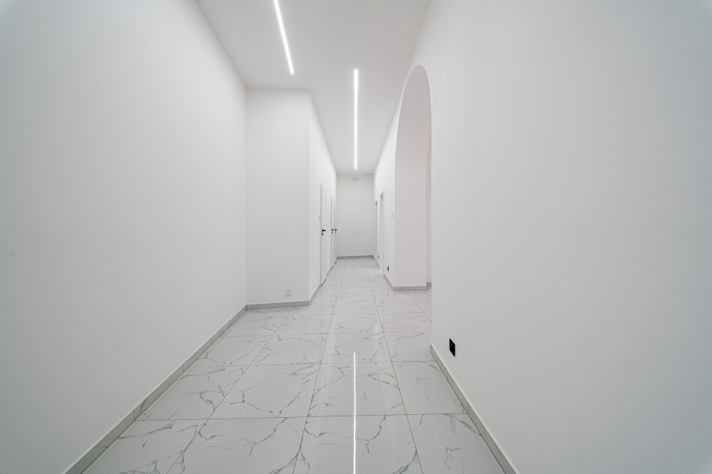 - Parketta a szobákban, márványhatású burkolat a közös terekben