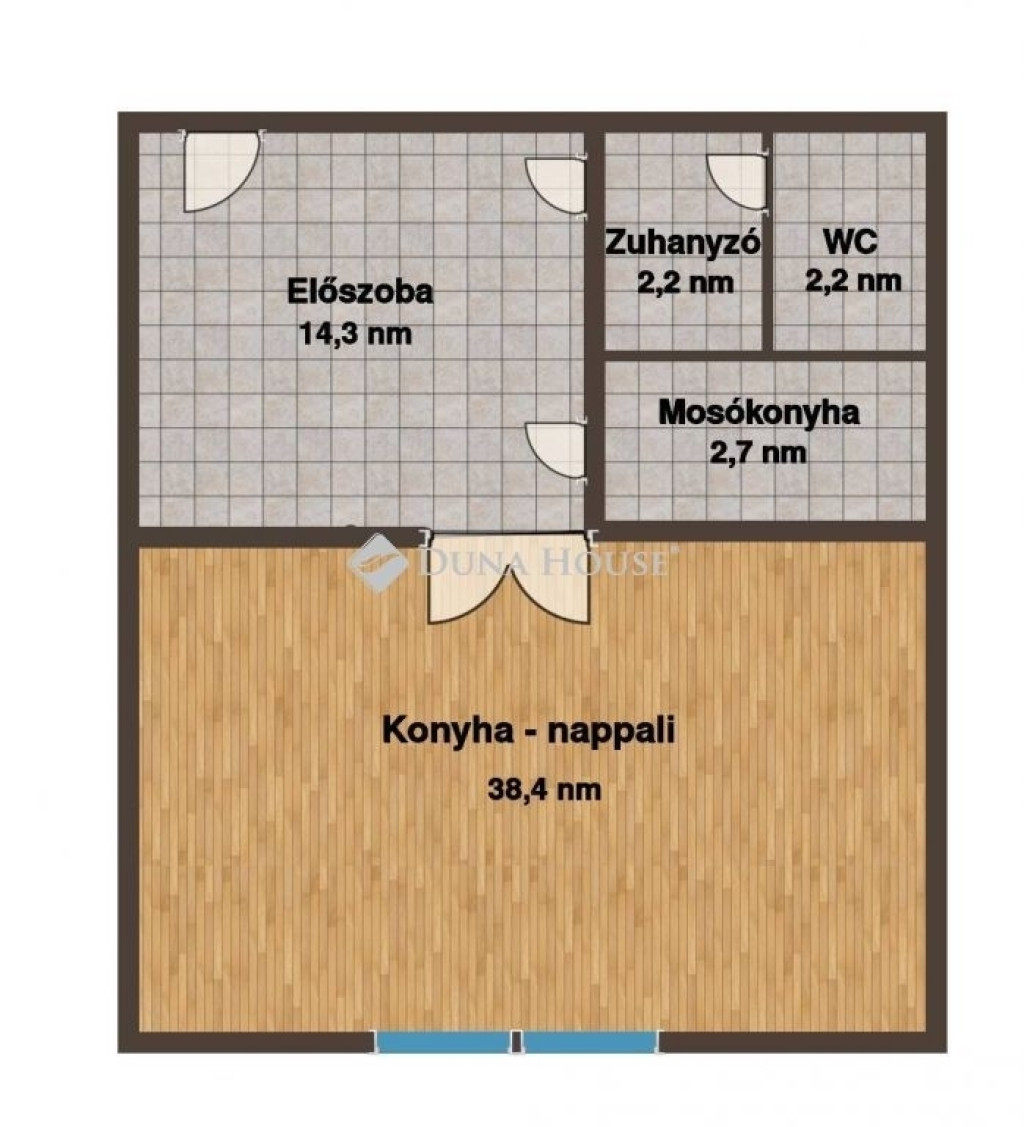 A mázas kerámiával burkolt, tágas előszobából nyílnak a lakás helyiségei.: a laminált pardlóval burkolt, nagy méretű (38,5 m2) szoba, ami amerikai konyhás nappaliként- hálóként funkcionál, az ablakon szellőző fürdő, amiben épített zuhany, mosdó van, és bejárat a szeparált wc-be.