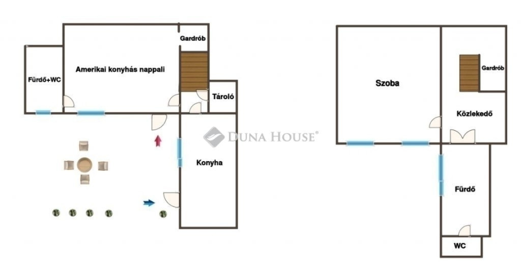 Kialakítás: - Kisebbik lakrész (földszint): 1 szoba konyhával, fürdő + WC, gardrób helyiség -Nagyobbik lakrész (földszint + emelet):Földszint: tágas, napfényes konyha + előszobaEmelet: hálószoba gardróbhelyiséggel, világos fürdő, külön nyíló WC