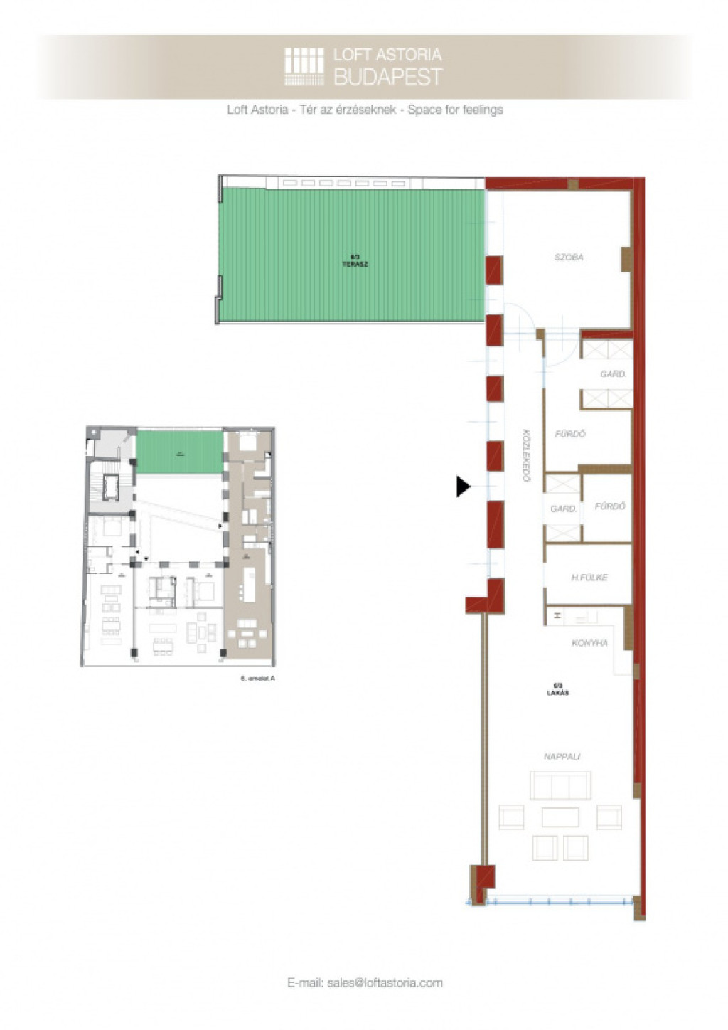 Az eladó ingatlan egy hatalmas nappali, konyhából, két tágas fürdőszobából walk-in zuhanyzóval és gardróbbal, egy hálófülkéből, valamit nagy méretű hálószobából áll, amelyből kijuthatunk a 42 m2-es teraszra, ahonnan csodálhatjuk a Citadellát. A lakás különlegessége a közel 5 méteres faltól-falig húzódó ablak, ahonnan a belvárosra láthatunk rá, a hatalmas belső terek és az osztott, fémkeretes ablakok, ajtók, amelyekkel elválasztják ezt a teret.