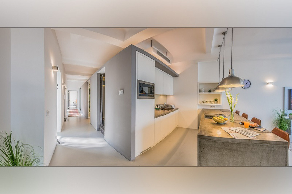 A stílusra jellemző az acélszerkezetek, a nyers beton és a kezeletlen fa használata, a szellős terek, nagy belmagasság, ezek visszaköszönnek az itt létrejött lakásokban.