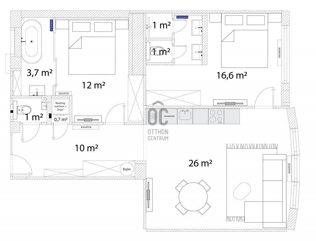 A komfortos hőérzetről minden szobában külön klíma berendezés gondoskodik, a fűtést a társasház központi kazánja biztosítja, a meleg vizet villanybojler szolgáltatja.