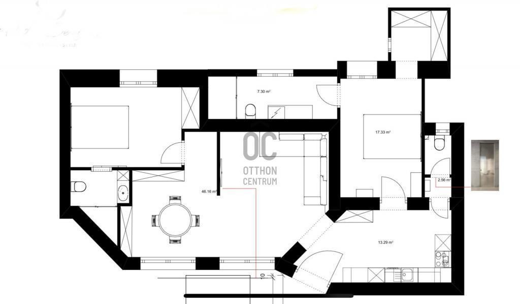 A lakás jelenleg tényleg vissza van bontva, és az alaprajz mutatja a jelenlegi válaszfalakat. Első körben így ebben az állapotban szeretnénk értékesíteni.