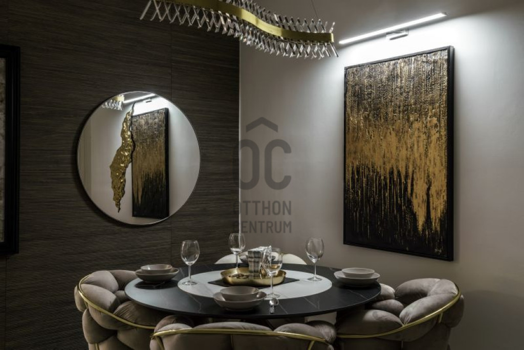 A délnyugati tájolású, világos, amerikai konyhás nappali látványkandallóval és design bútorokkal berendezett tér tökéletes otthon vagy befektetés.