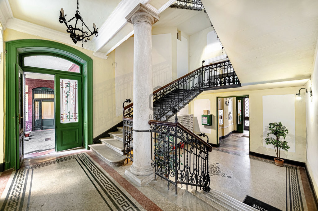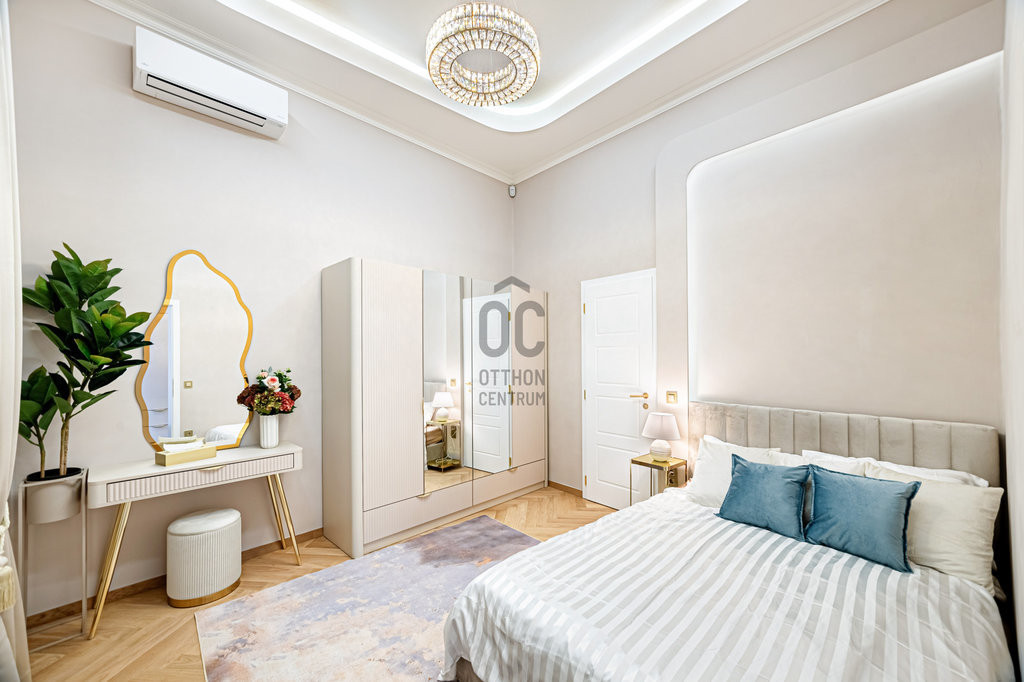 A társasház a 19. század végén épült, historizáló stílusjegyekkel, belső udvarral és díszes lépcsőházzal. A lakás teljes körű felújításon esett át, prémium anyagokkal, márványhatású felületekkel, dekoratív falpanelek és arany tónusú részletek alkalmazásával. A belső terek világosak, harmonikusak és azonnal költözhetőek.