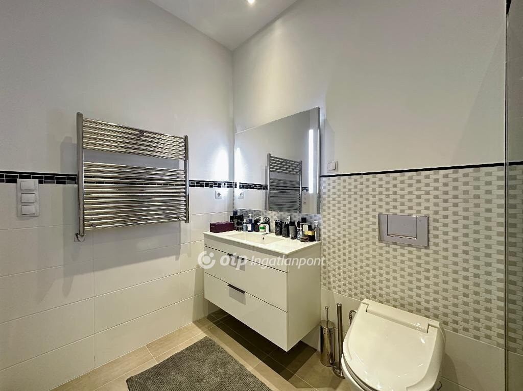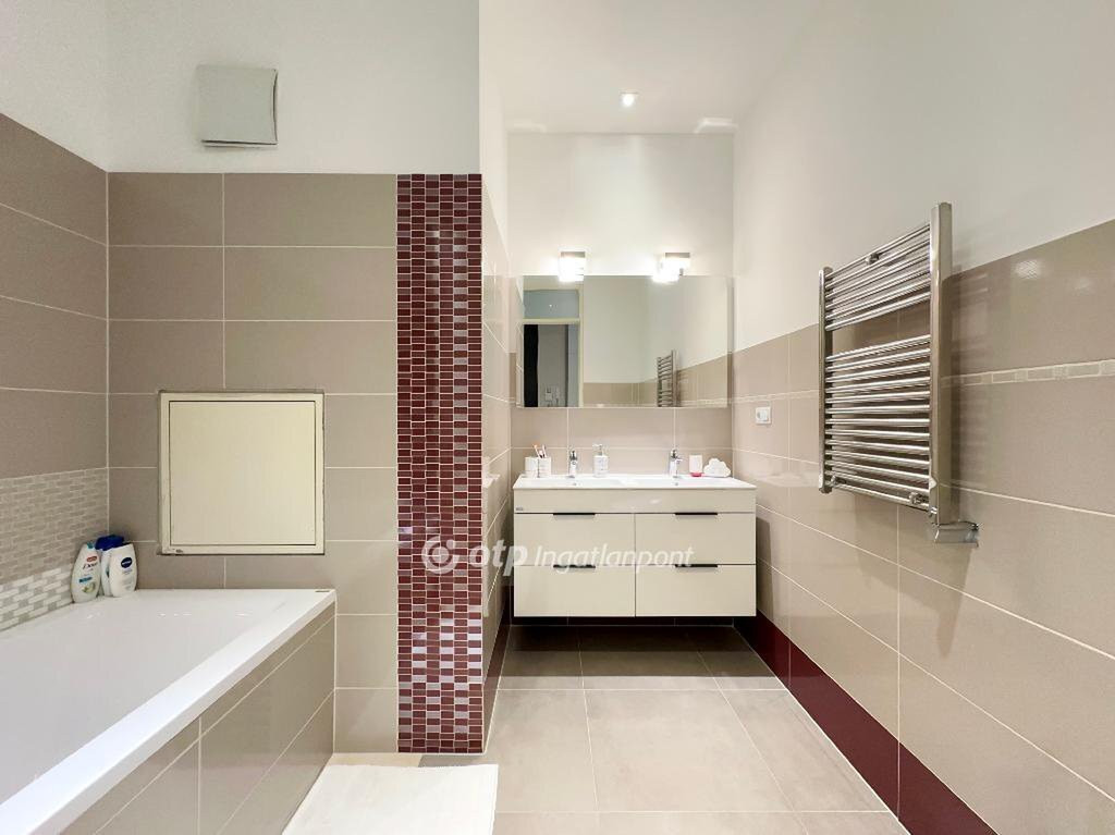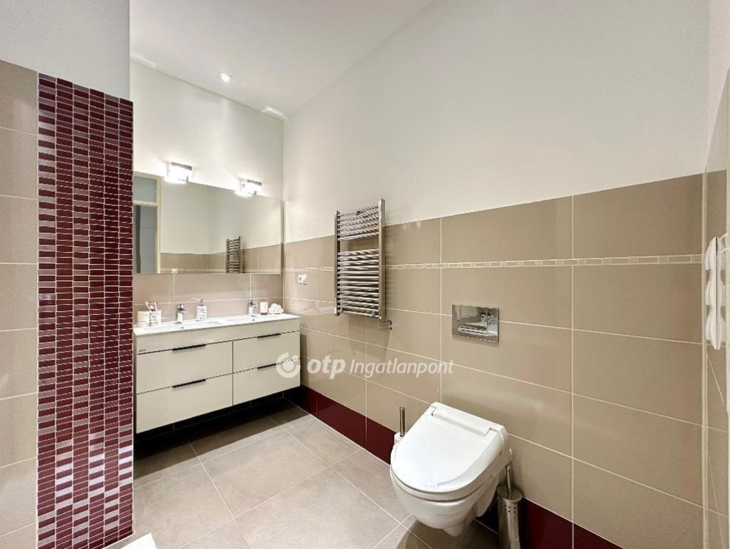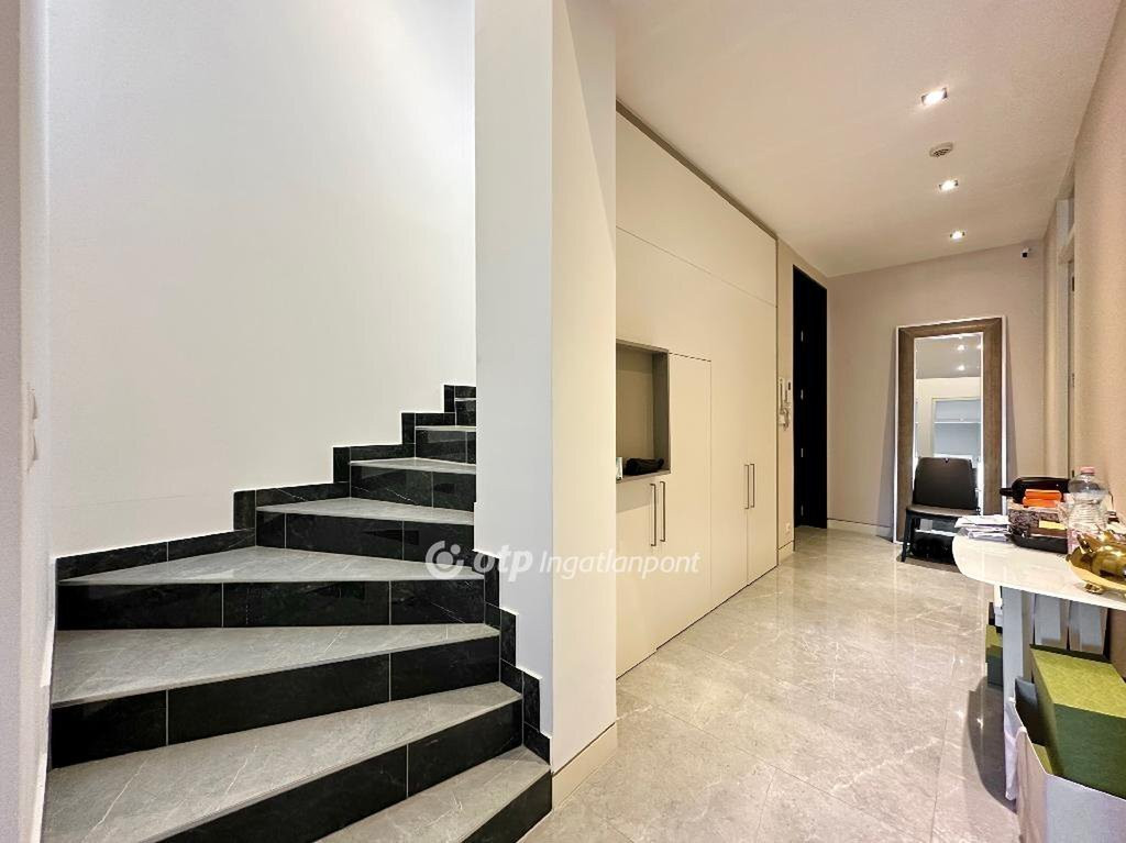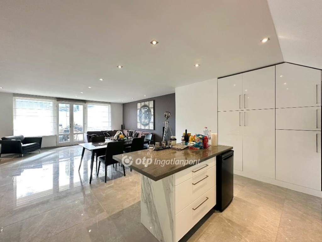 Az ingatlan elrendezése átgondolt és élhető: az alsó szinten egy tágas, amerikai konyhás nappali-étkező tér kapott helyet, amely ideális a mindennapi élethez és vendégek fogadásához is. A lakás két külön nyíló hálószobával és két igényesen kialakított, modern fürdőszobával rendelkezik, így akár családok, akár elegáns városi rezidenciát keresők számára is kiváló választás.