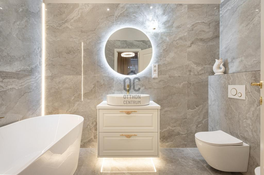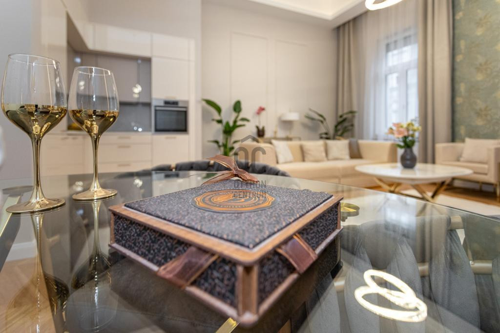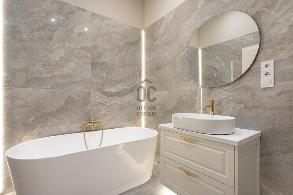 Az ingatlan amerikai konyhás nappalival rendelkezik, mindkét hálószobához külön fürdőszoba tartozik: a fő hálószobához egy elegáns káddal, WC-vel és bidével felszerelt fürdőszoba kapcsolódik, míg a második szobához egy zuhanyzós fürdő. Az ingatlan prémium minőségű bútorokkal és gépekkel együtt eladó, így az új tulajdonos azonnal beköltözhet egy teljesen felszerelt, exkluzív otthonba.
