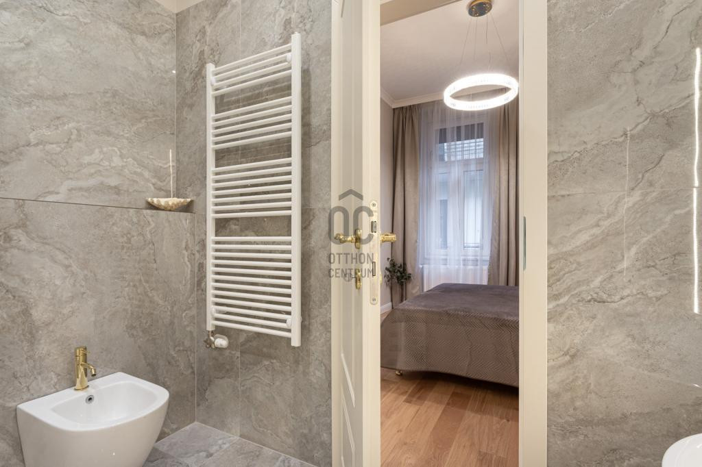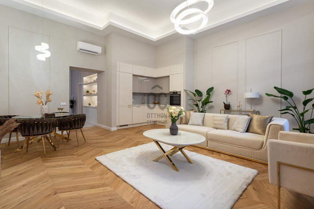 A teljes körű felújítás során megtörtént a víz- és villanyvezetékek, valamint a fűtéscsövek, radiátorok cseréje. Designer csillárok, beépített szekrények, minőségi szaniterek és prémium burkolatok kerültek beszerelésre. A 4,3 méteres belmagasság igazán légies, tágas hangulatot ad a lakásnak, a chevron mintás tölgyfa parketta eleganciát és egyediséget. A konyha teljesen gépesített, AEG márkájú készülékekkel felszerelt: mosogatógép, hűtő fagyasztóval, sütő, mikró, főzőlap, páraelszívó és mosógép is rendelkezésre áll. A lakás légkondicionált.