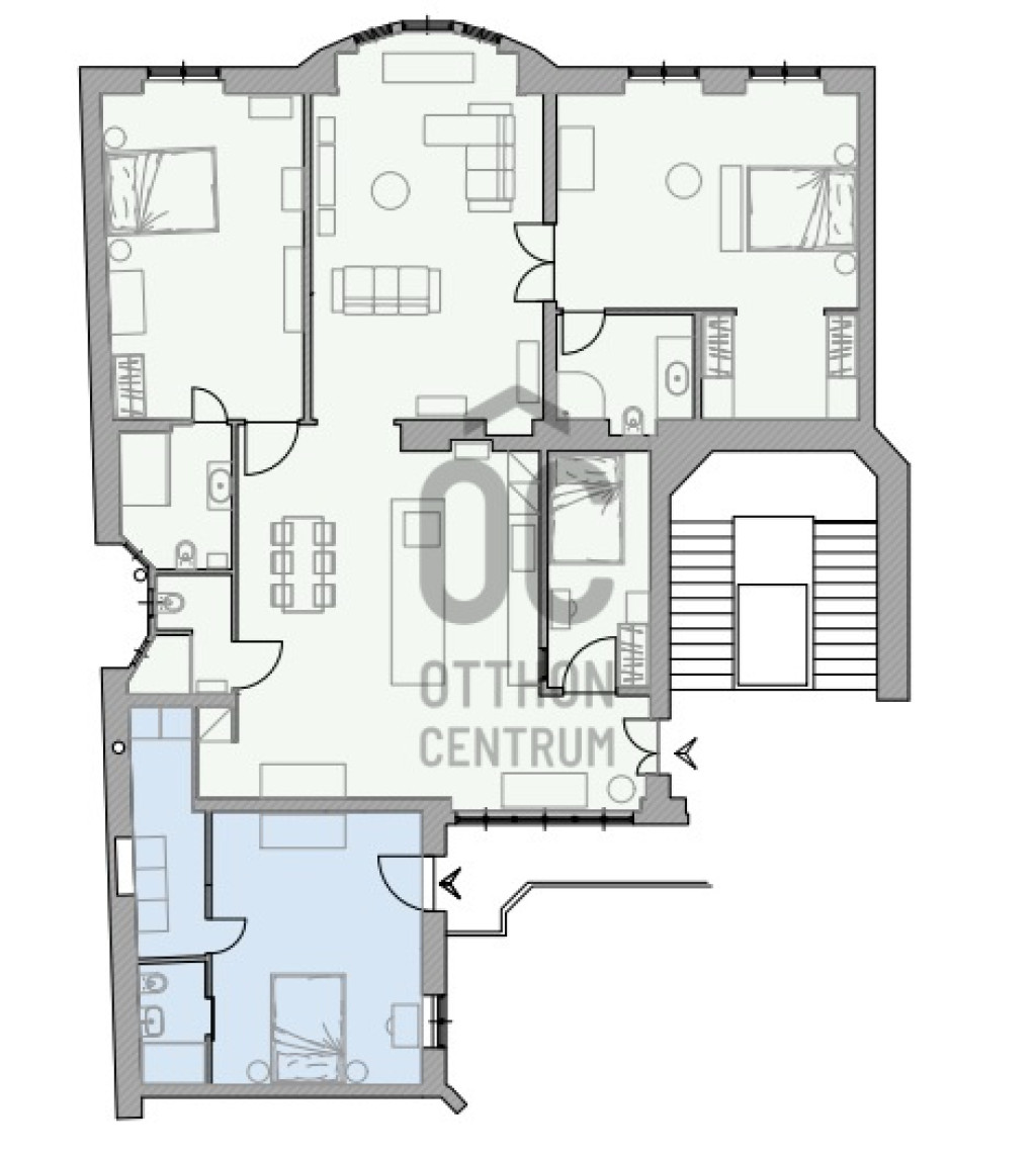 Jelenleg egy nagy és kis lakásból áll, a kisebb lakás külön bejáratú, de könnyedén egybe lehet nyitni, ha valaki úgy szeretné, öt tágas szobával és négy fürdőszobával rendelkezik, így ideális választás lehet családok számára, vagy akár befektetési célra is.