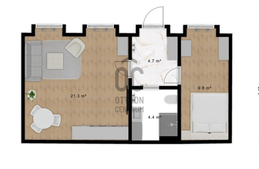 Elosztása: előszoba (4,4 m²), hálószoba (10 m²), zuhanyzós fürdőszoba (4,7 m²), amerikai konyhás nappali (21,3 m²).
