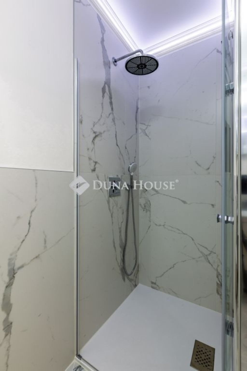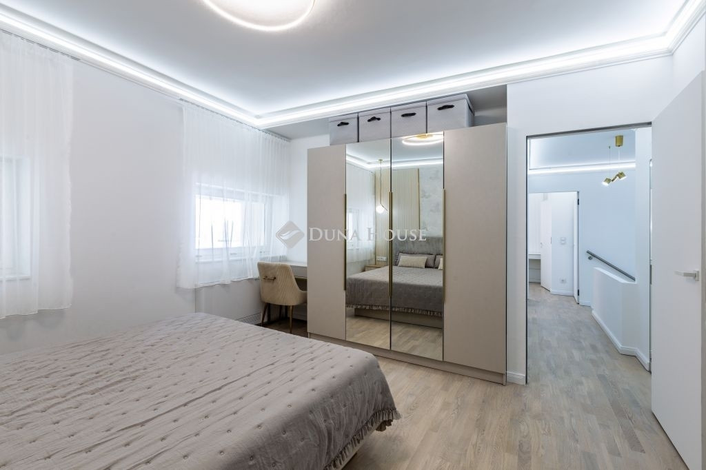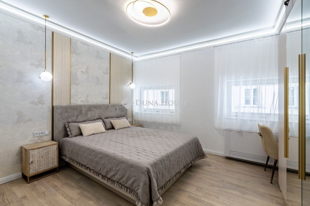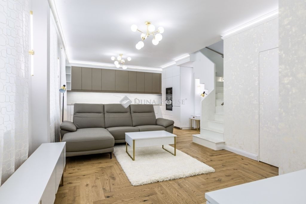 A LAKÁS ELKÉSZÜLT ÉS KÖLTÖZHETŐ!*******Eladó egy belső kétszintes, magas minőségben és teljes körűen felújított, berendezett, 94 m²-es design lakás, a belváros egyik patinás műemléki épületében, pár lépésre a Duna-parttól.A lakás főbb jellemzői: Belső kétszintes kialakítás (teljes értékű belmagasság, az alsó szinten 275 cm, felső szinten 265 cm) modern elosztás, kiváló térhasználat 3 hálószoba, 2 fürdőszoba, külön WC, járható gardrób Világos terek, csendes, udvarra néző ablakok Teljesen BERENDEZETT azonnal költözhető Fűtés-hűtés: fan-coil rendszer SPRSUN hőszivattyúval, külön H-tarifás mérő Elektromos hálózat: új, 3×32 A, minden fogyasztó külön körön Beépített gépesített konyha (AEG), kvarcit kő munkapult, Hansgrohe csaptelepek. Prémium kivitelezés: Svájci rétegelt parketta, olasz nagylapos márványhatású gres (Marca Corona) Egyedi világítás stukkóba épített LED szalagok, távirányítós fényerőszabályzó Modern belső nyílászárók Harmony tapétaajtók Fürdőszobák: LED tükrök, Hansgrohe/ Kludi csaptelepek, esőztető zuhanyok Márvány lépcsők, igényesen kialakított tárolók. Műszaki háttér: Új víz- és szennyvízrendszer Központi páramentesítő és szellőzőrendszer Tűz- és betörésjelző rendszer Új fa ablakok (dupla üvegezés, műemléki engedéllyel) Külön villanyóra + H-tarifás mérő Berendezés: Beépített szekrények, teljes konyhabútor, étkezőasztal, kanapé, ágyak, függönyök, világítótestek MINDEN BENNE van az árban!