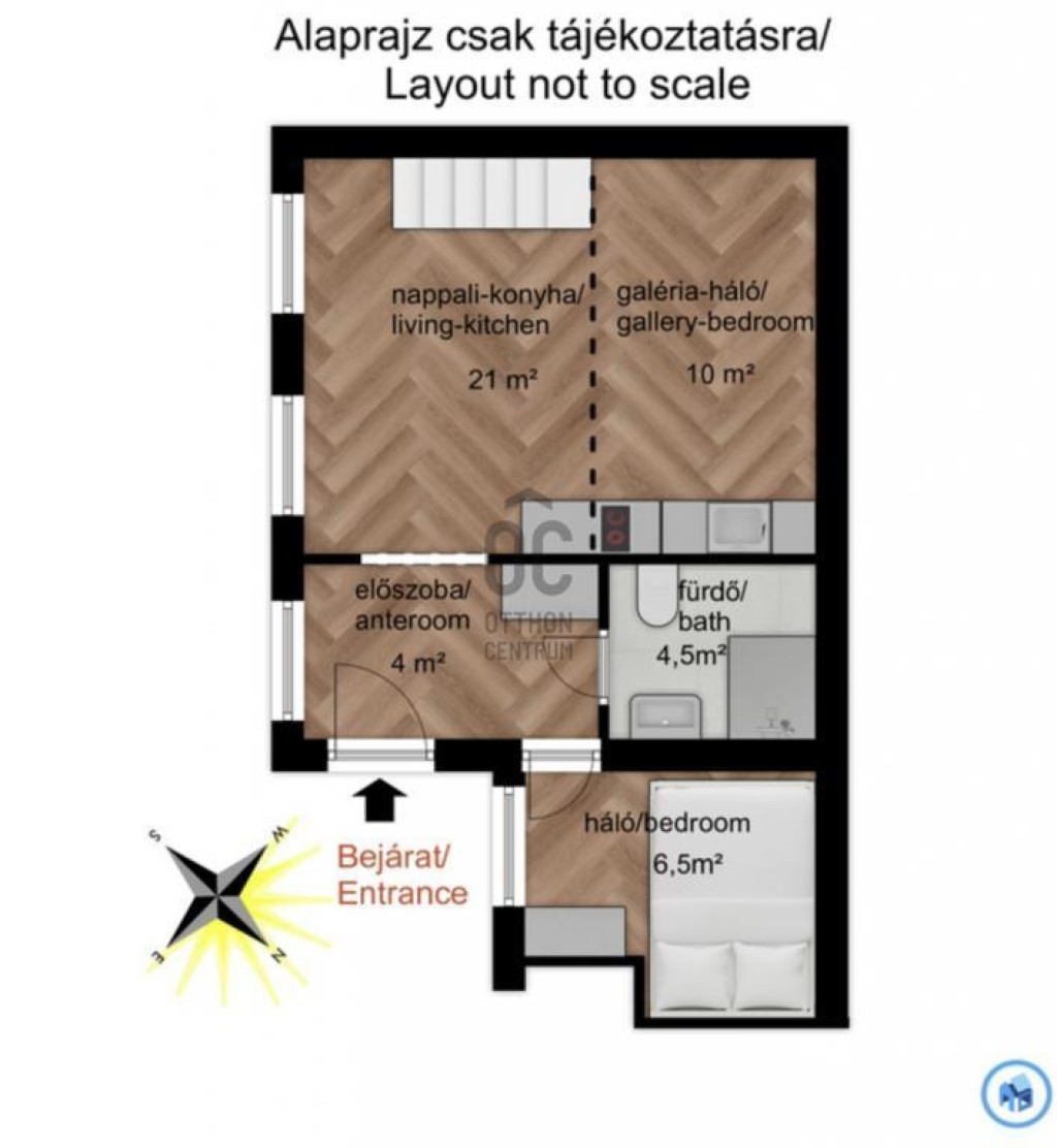 Elrendezése amerikai konyhás nappali, két külön hálórész melyből az egyik a 205 cm belmagasságú galérián található, fürdőszoba, előszoba és egy kis hangulatos teraszrész a bejárat mellett. Udvari fekvésének köszönhetően csendes és nyugodt