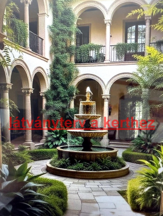 A GYÖNYÖRŰ homlokzatú védett épületben az elektromos hálózatot, a teljes tetőt cserélték, új lifttel rendelkezik, a kiváló klímájú udvar is szép, ide a ház egy virágoskertre pályázik, ez a látványterv a fotón látható.