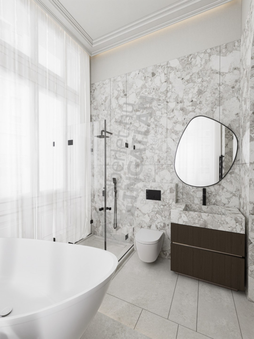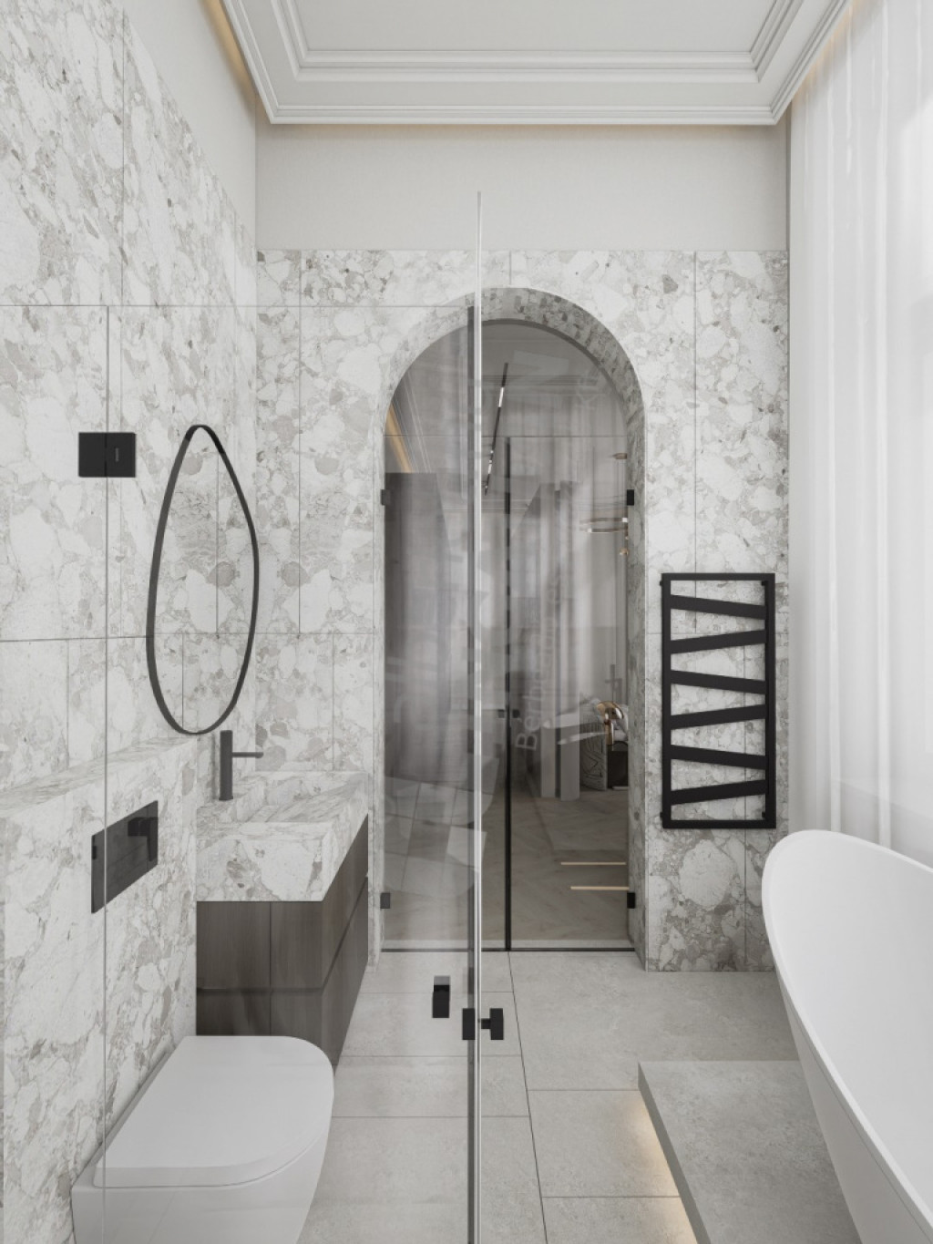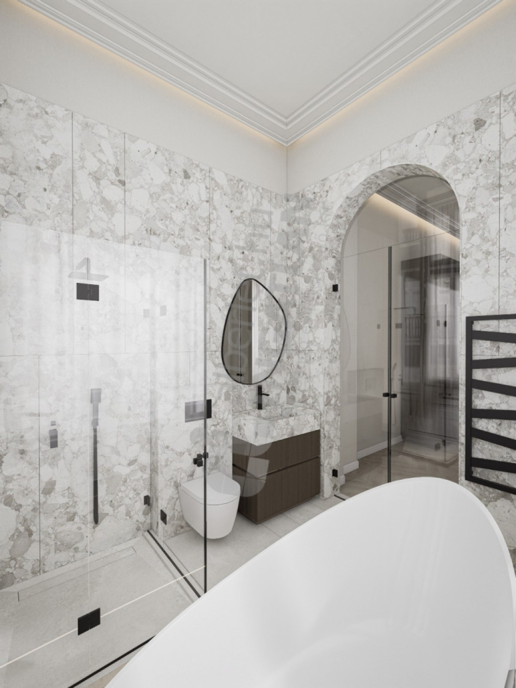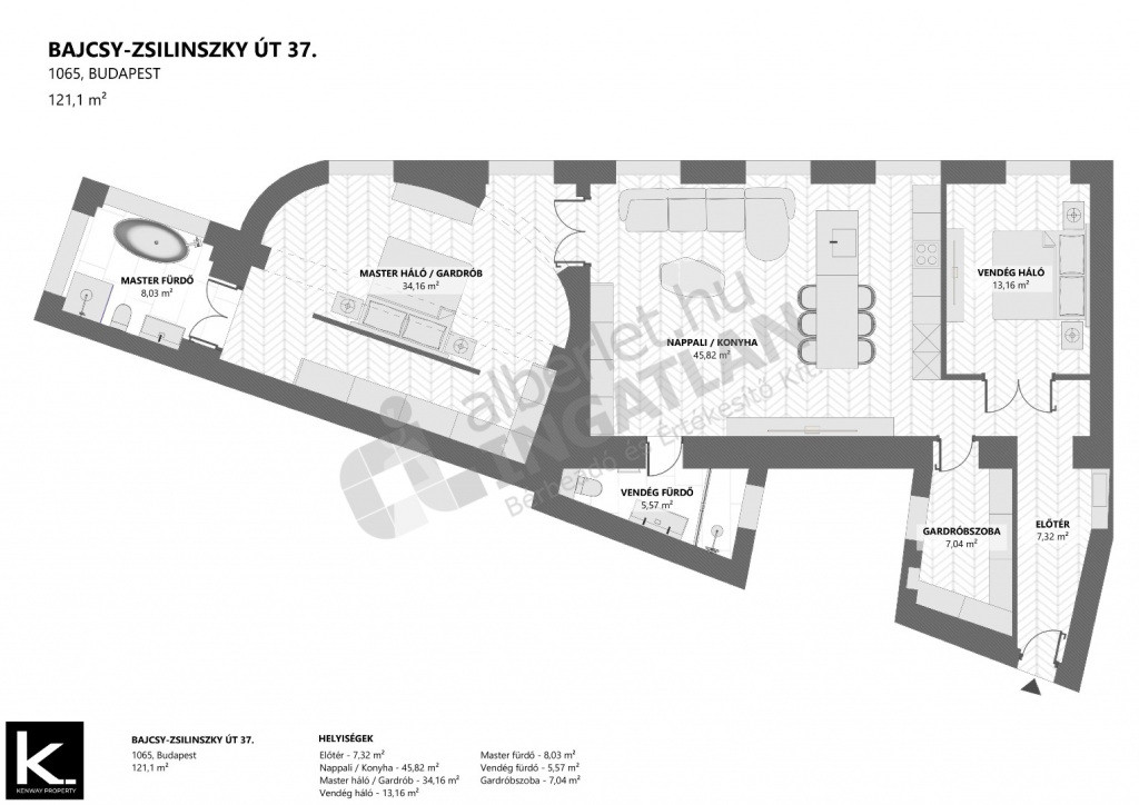 A belsőépítészek teljesen újragondolták az alaprajzot, így egy modern, kényelmes elrendezés született: két különálló hálószoba, két stílusos fürdőszoba, valamint egy tágas, amerikai konyhás nappali alkotja az otthon központi terét. A belső kialakítás során prémium minőségű anyagokat használtak, a végeredmény pedig egyszerre elegáns és otthonos. A meleg árnyalatú tölgyfa parketta természetes karaktert ad a térnek, melyet a Kenway Property tervezőcsapata által készített, helyszínre szabott bútorok tesznek teljessé. Az egyedi mennyezeti és oldalfali gipszdíszítések különleges, klasszikus jegyekkel gazdagítják az enteriőrt.