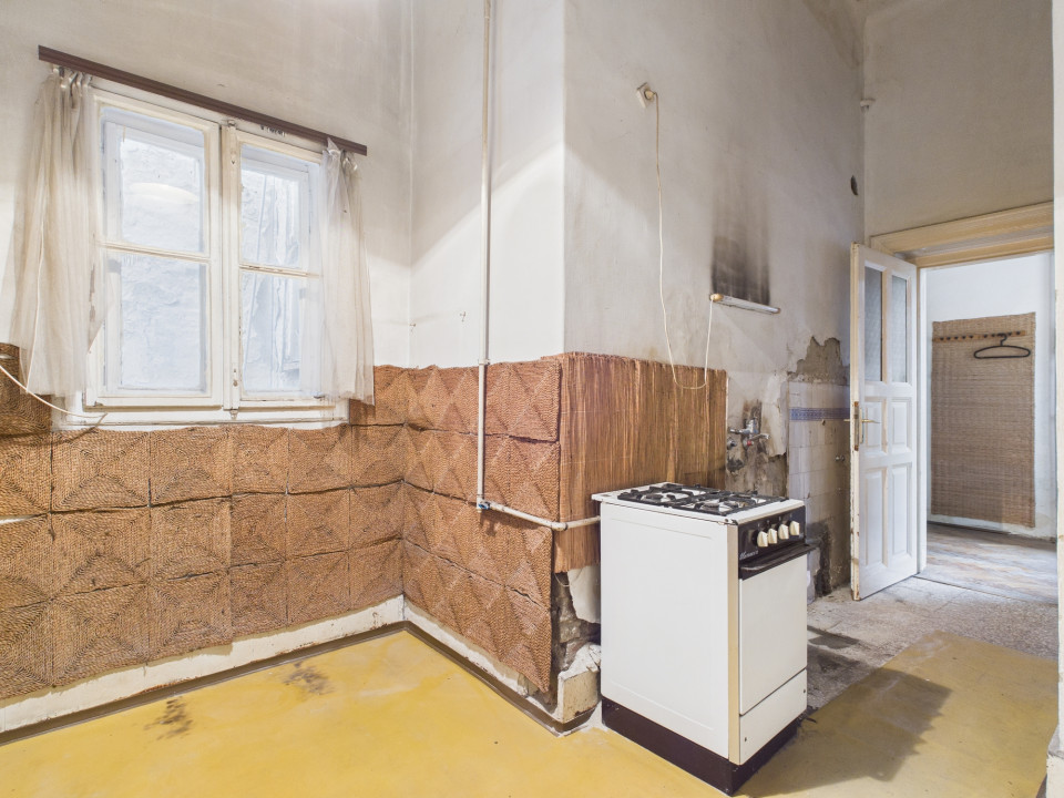 A konyha és a vizesblokkok teljes felújításra szorulnak, ami teret ad modern gépészet, új burkolatok és személyre szabott megoldások beépítésére.