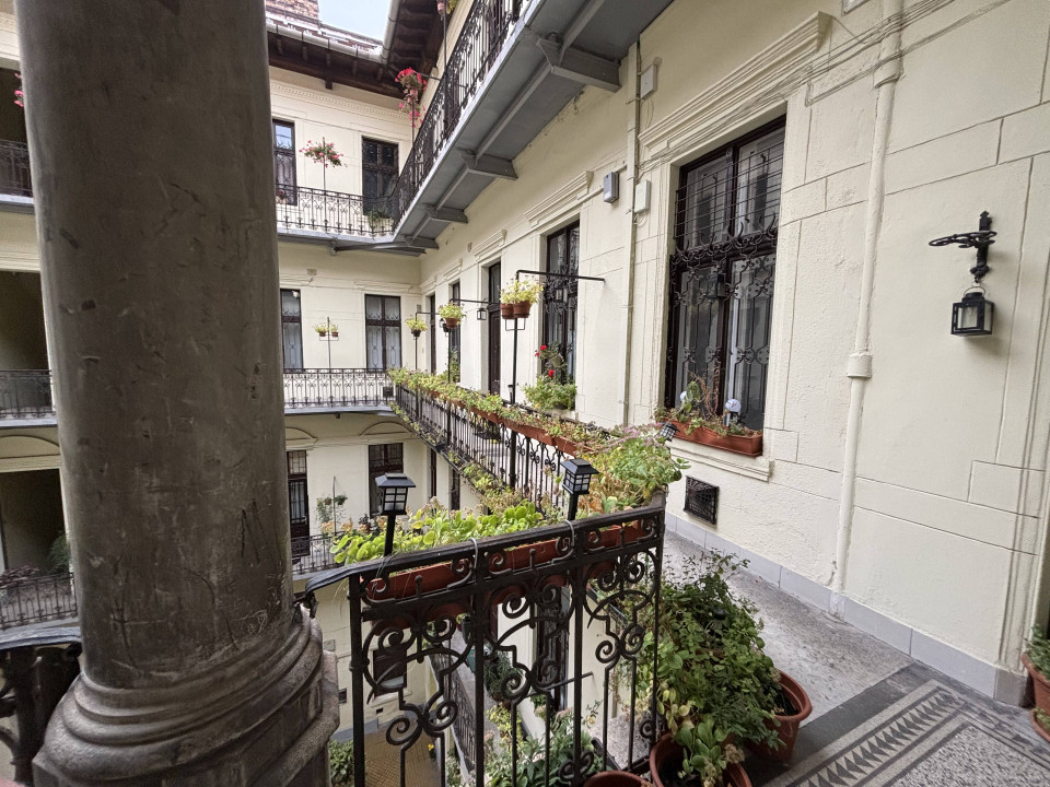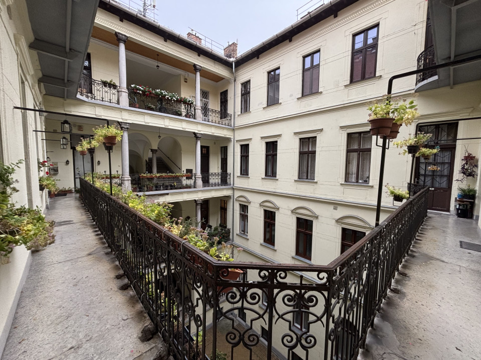 A homlokzat klasszikus részletei, a díszes kapualj és az eredeti lépcsőház mind a korszak hangulatát idézik, miközben jó állapotban maradtak fenn. A belső udvar tágas és rendezett, a körfolyosók stabil, felújított szerkezetűek, kovácsoltvas korlátokkal és hangulatos fényviszonyokkal.