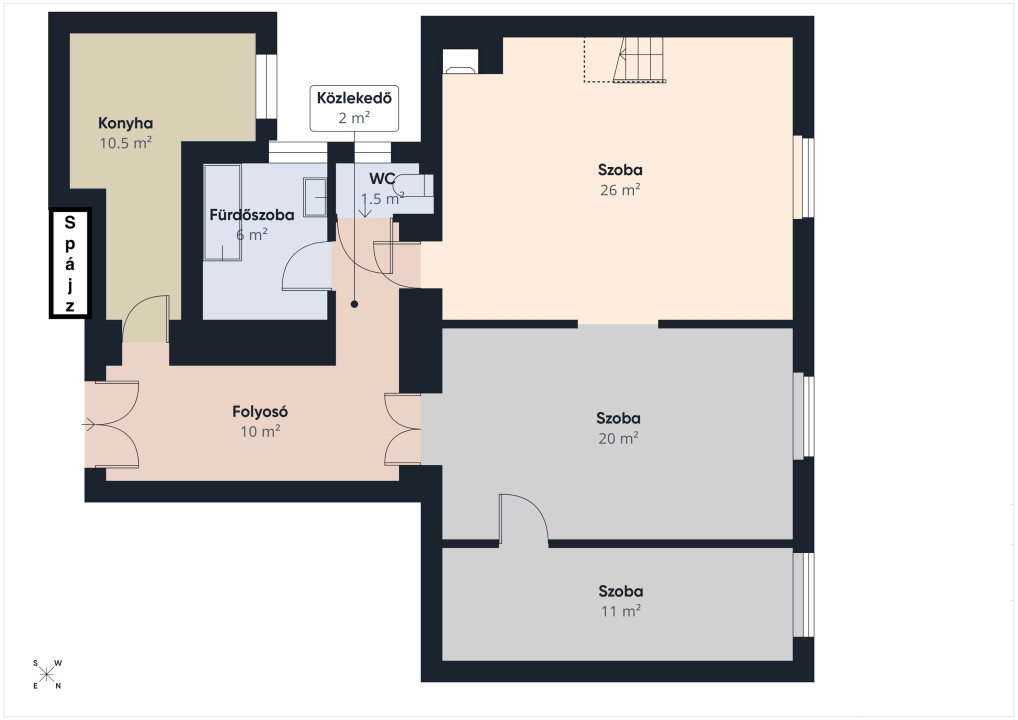 Jelenleg 2+1 fél szobával rendelkezik, a harmadik szoba a bejárattal szembeni nagyméretű helyiségből került leválasztásra.
