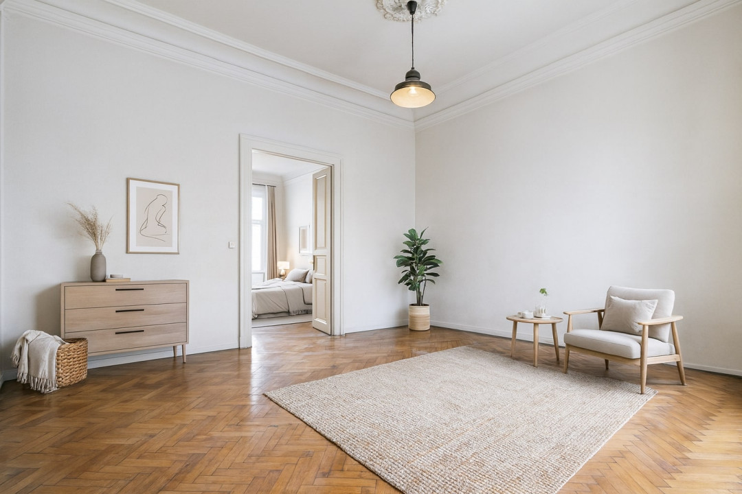 Az eredeti nyílászárók és parketta restaurálása karaktert kölcsönözhet az újonnan kialakított tereknek, így a lakás egyszerre őrizheti meg a századfordulós hangulatát és nyújthat korszerű kényelmet.