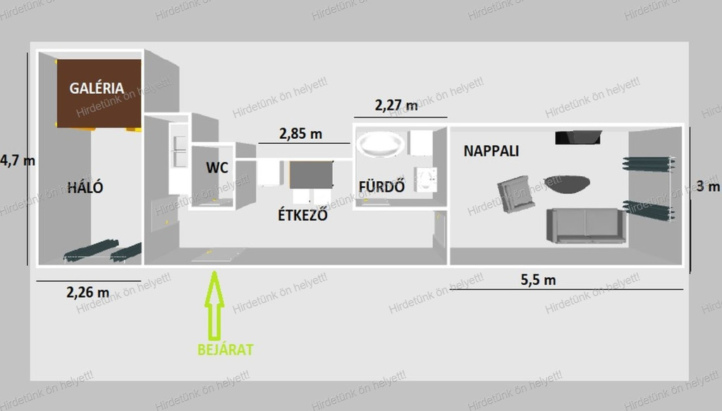 A lakásban nappali, egy galériázott háló, fürdő, külön wc és konyha-étkező található.