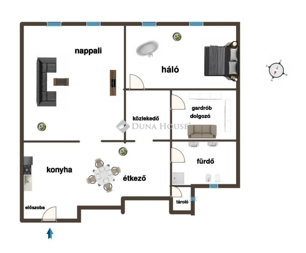 Az elrendezés praktikus és sokoldalú: a nappali mellett egy külön nyíló szoba, valamint egy gardróbnak vagy dolgozószobának is alkalmas helyiség áll rendelkezésre. A külön konyha és étkező kényelmesen használható, a fürdőszoba és a WC egy helyiségben található. A lakás adottságai lehetővé teszik, hogy saját igények szerint tovább alakítható legyen.