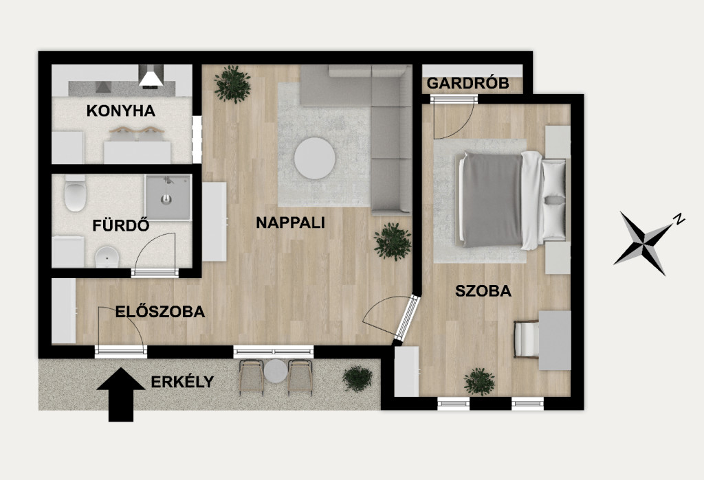 Az 57 m2-es ingatlan amerikai konyhás nappali, hálószoba, gardrób, fürdőszoba és előszoba elosztású. Egyszerre csendes és világos, köszönhetően belső udvari nézetének és 4. emeleti elhelyezkedésének. Utolsó lakás az emeleten, így belsőudvari folyosója hangulatos teraszként használható.